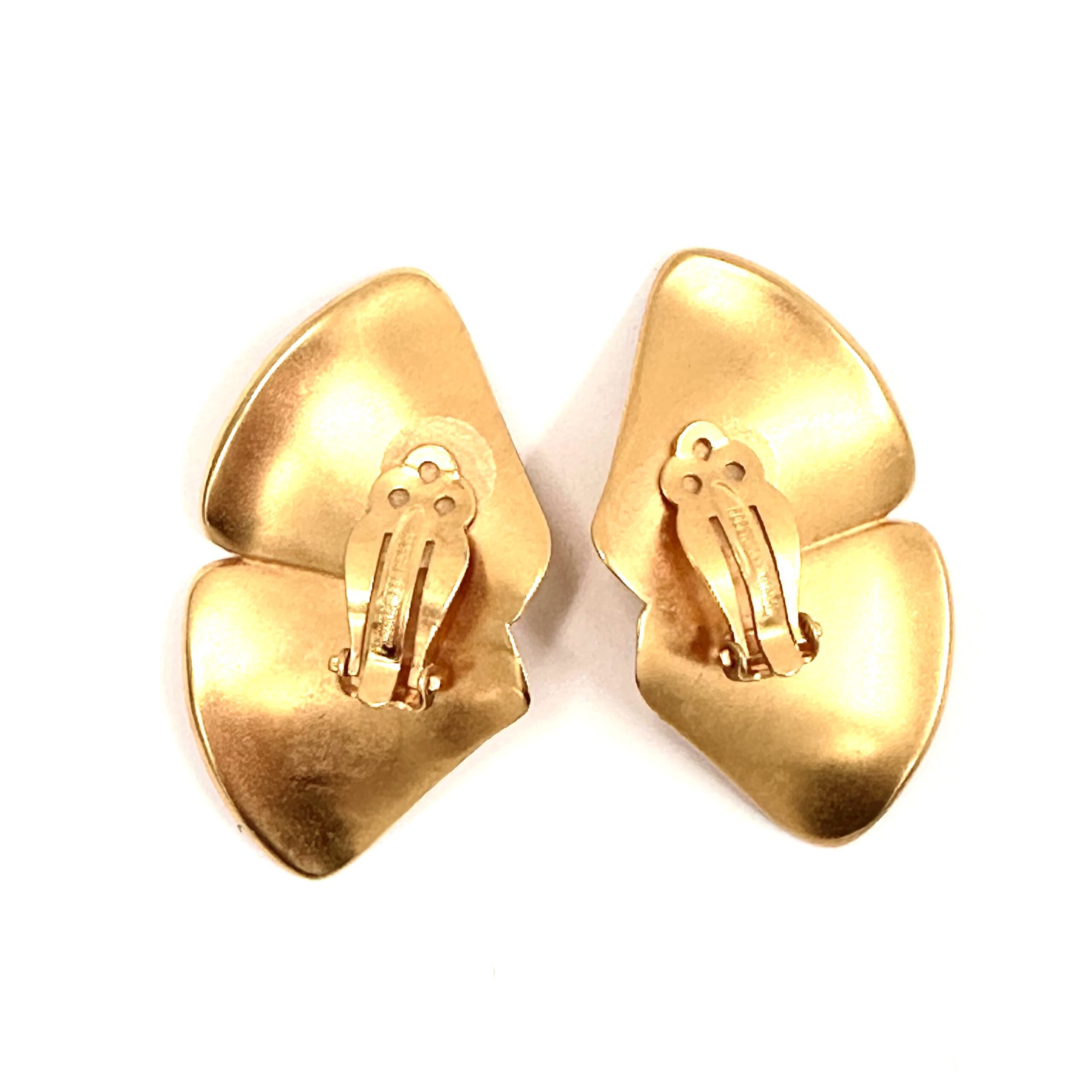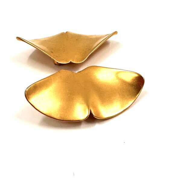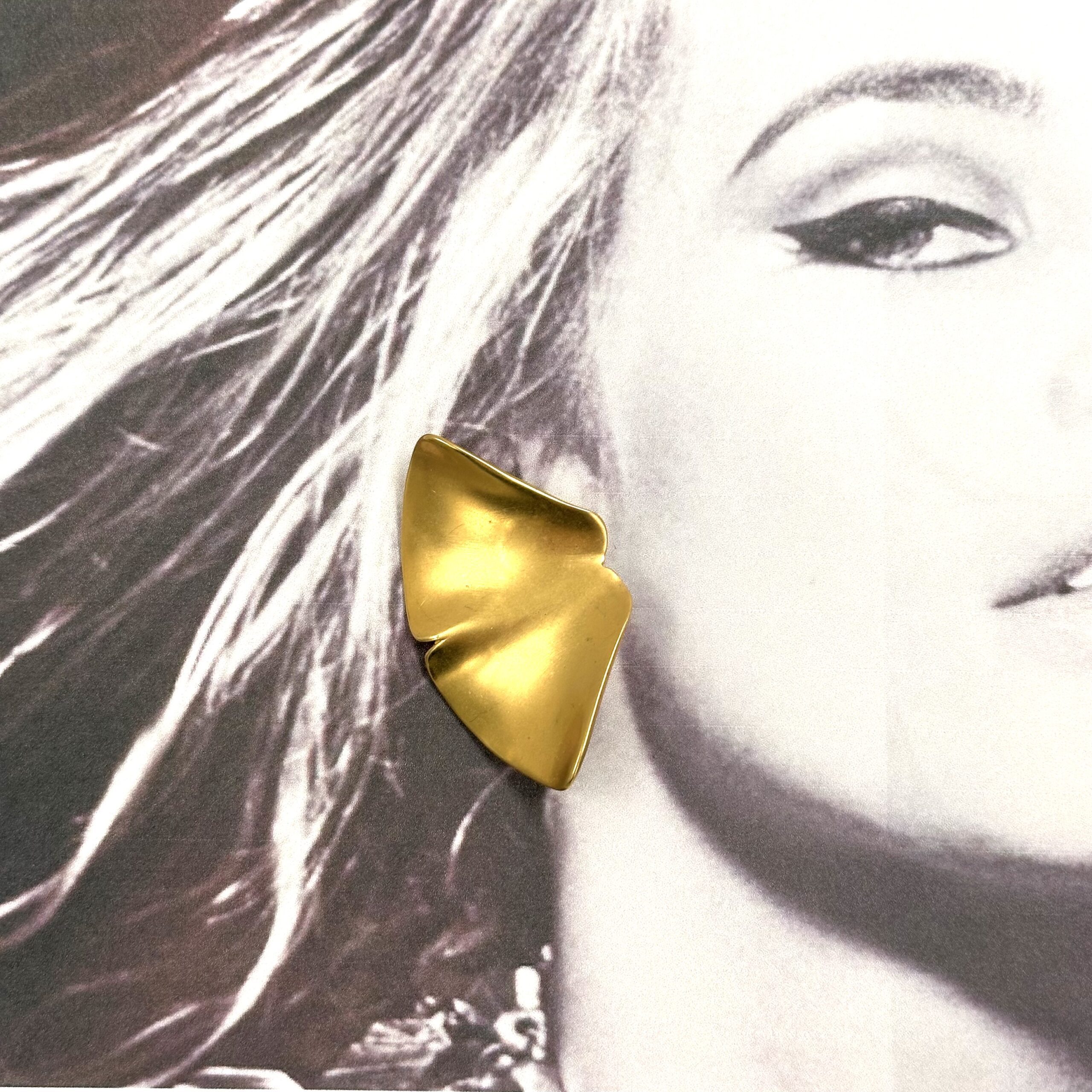 These gorgeous Robert Lee Morris Flared Leaf Earrings are inspired by Ginko leaves as well as moth or butterfly wings. The softness and mystery of the curving forms is hypnotic. A very bold earring statement, both in the design and in the scale which is quite large.The gold plating is rich in the way the matte surface adds to a subtle glow inside the gold. Glowing Gold.