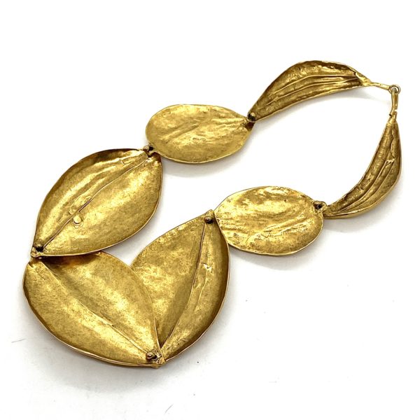 When I was launching my leather-goods collection in the late 80’s, of handbags, belts and dog collars, I also created a new collection of jewelry. This was the new Pro Earth Green movement in the early 1990’s whereby the themes were all about flowers and vegetation. I created wax carvings of every kind of nature I could conjure up. trees, branches, roots, leaves and buds. These vines and organic living imagery became part of my new leather-good’s line. Jewelry was what directed the hardware, and this necklace is a major part of the Green look I did then. Bold. Powerful, Rare, and still comfortable around the neck. Gold plated brass 1989.