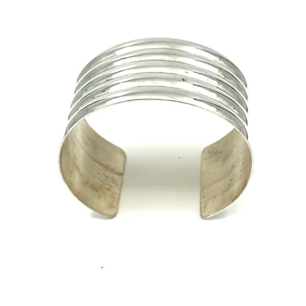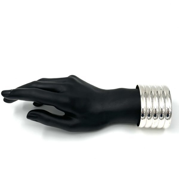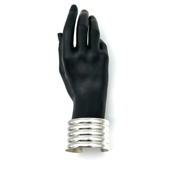 This impressive Robert Lee Morris for Calvin Klein Sterling Silver 5 ribbed Cuff, is part of the collection Morris made for the Calvin Klein stores in the early 90’s. Calvin wanted Morris to create a special unique collection of silver jewelry, bracelets, earrings, and hair barrettes that would smack of the clean minimal CK style, and this is what it looked like. Calvin and Robert had worked beautifully together in 1981 and this was a renewal of that bond. Sold only in his top stores, beginning with the flagship on Madison Avenue in New York City, the craftsmen in the RLM workshop in Soho endeavored to make this very iconic collection. Most of these pieces now listed on this website are actually marked with the Calvin Klein logo and re the remaining prototypes that Morris has in his archives. Calvin was inspired by the jewelry that Georgia O’Keefe wore, which had the feeling of classic Southwestern jewelry.