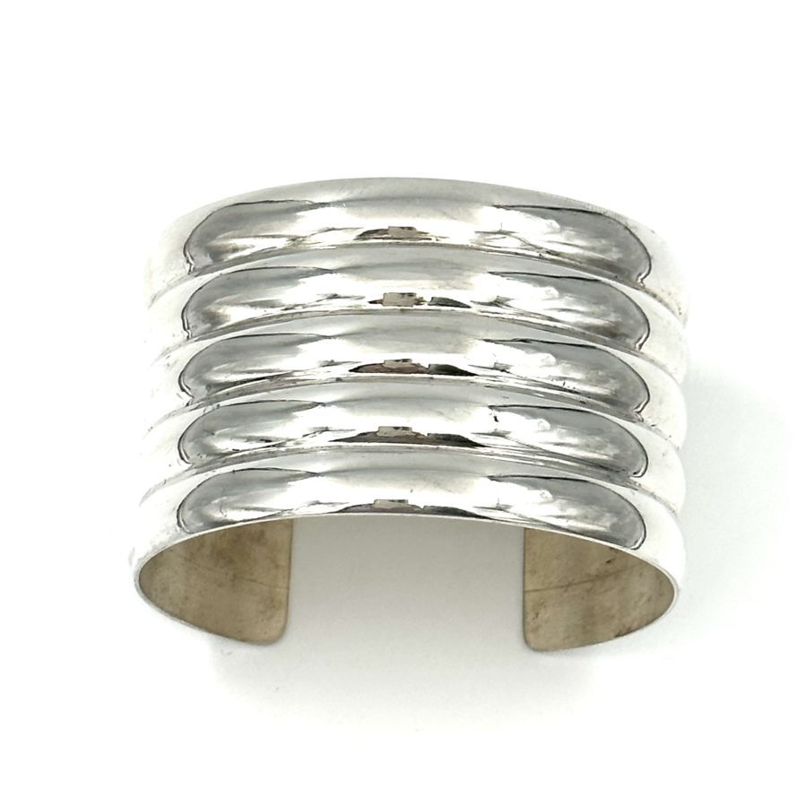 This impressive Robert Lee Morris for Calvin Klein Sterling Silver 5 ribbed Cuff, is part of the collection Morris made for the Calvin Klein stores in the early 90’s. Calvin wanted Morris to create a special unique collection of silver jewelry, bracelets, earrings, and hair barrettes that would smack of the clean minimal CK style, and this is what it looked like. Calvin and Robert had worked beautifully together in 1981 and this was a renewal of that bond. Sold only in his top stores, beginning with the flagship on Madison Avenue in New York City, the craftsmen in the RLM workshop in Soho endeavored to make this very iconic collection. Most of these pieces now listed on this website are actually marked with the Calvin Klein logo and re the remaining prototypes that Morris has in his archives. Calvin was inspired by the jewelry that Georgia O’Keefe wore, which had the feeling of classic Southwestern jewelry.
