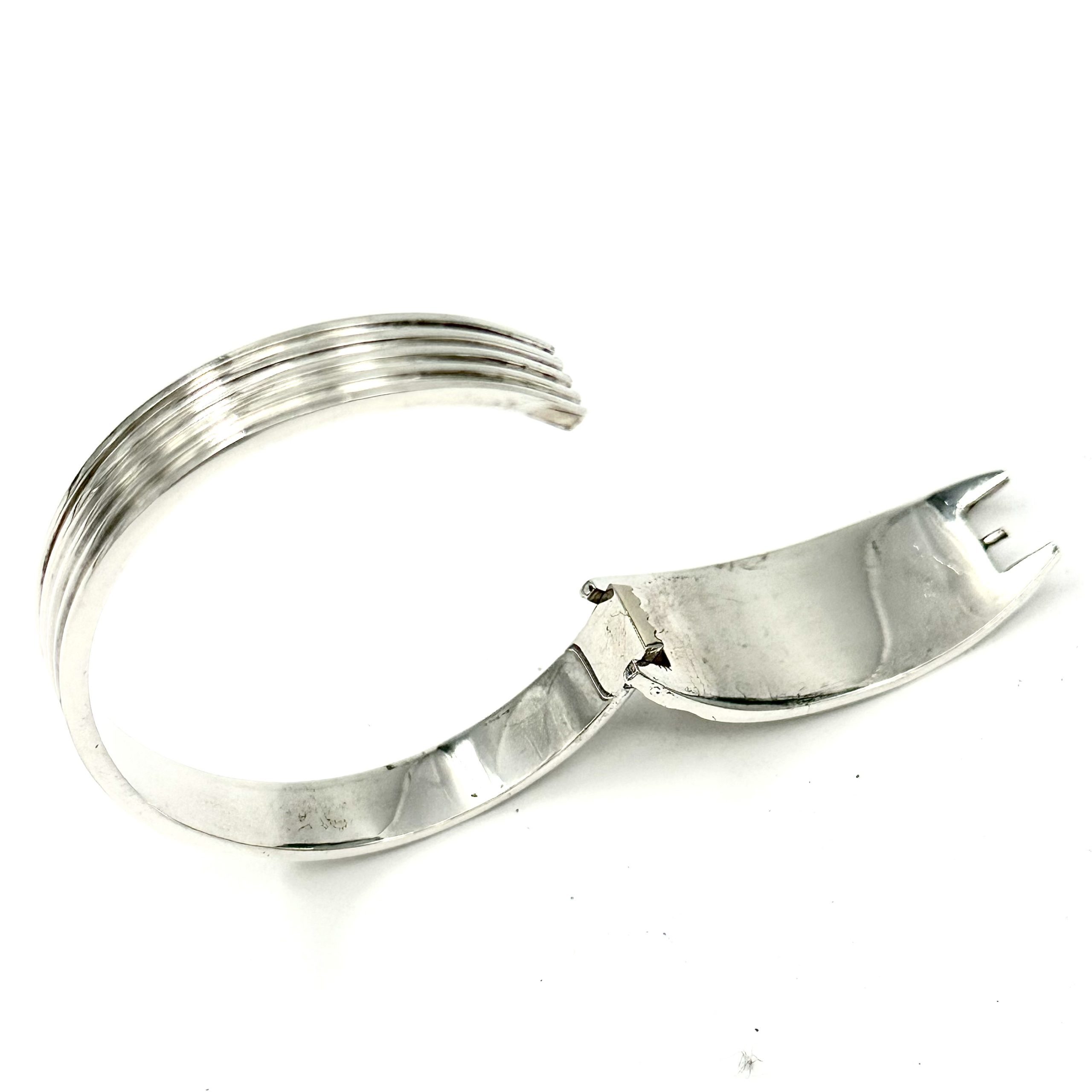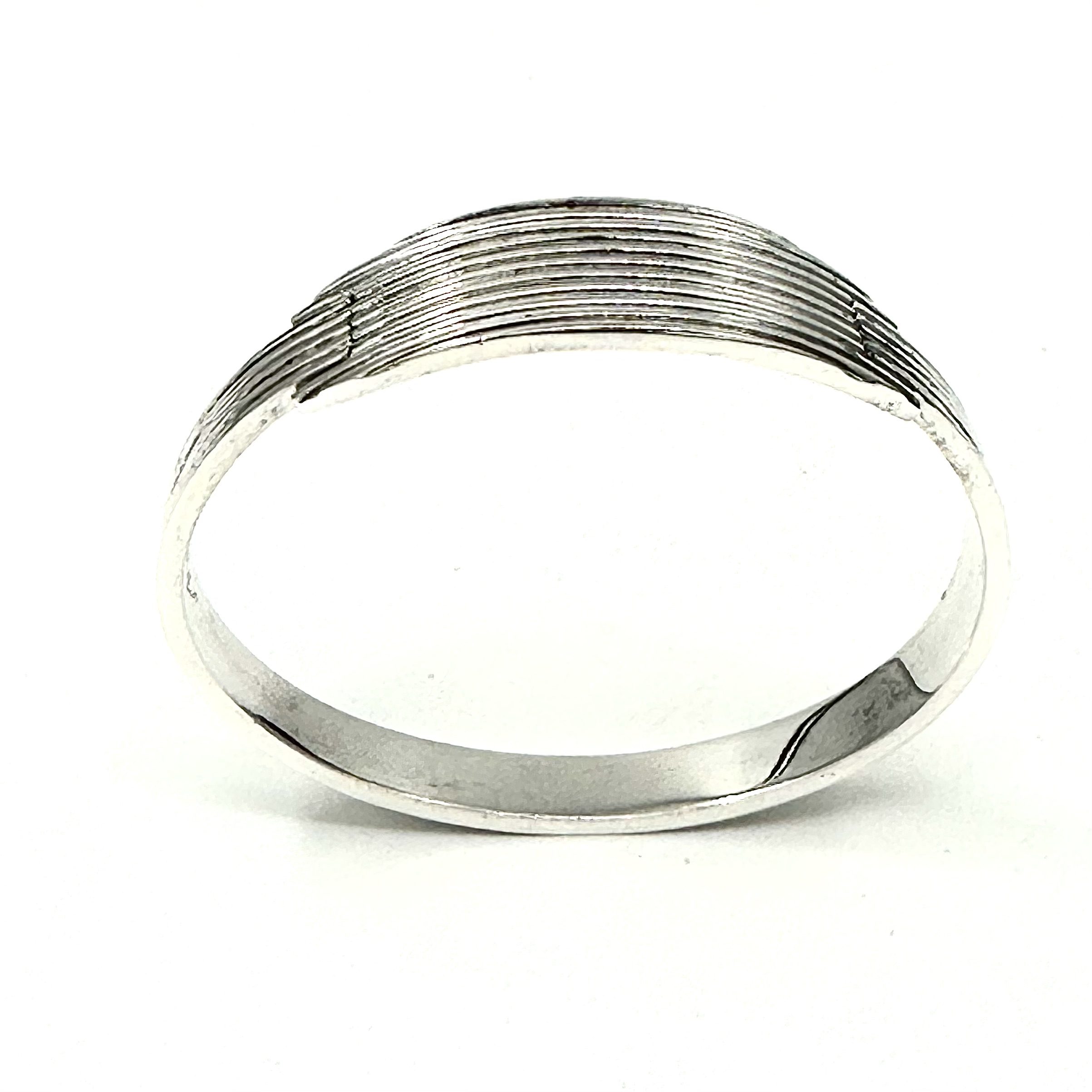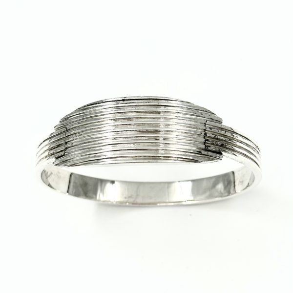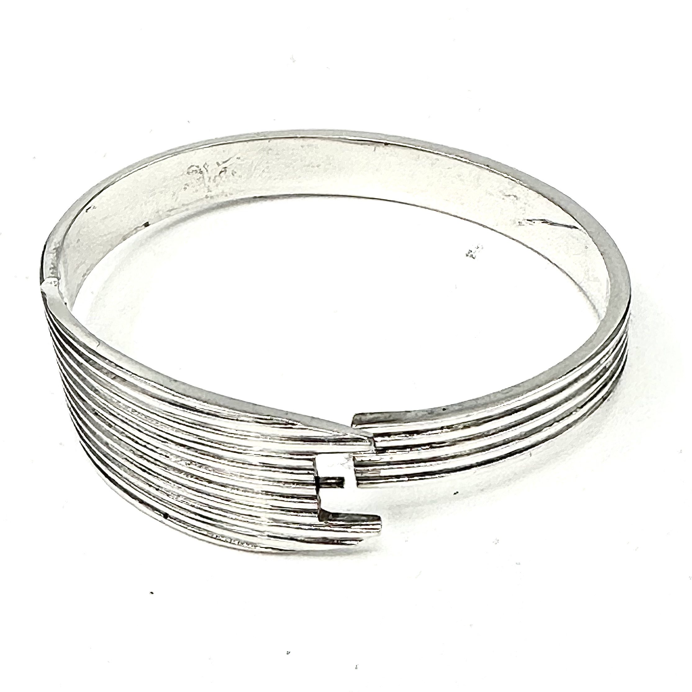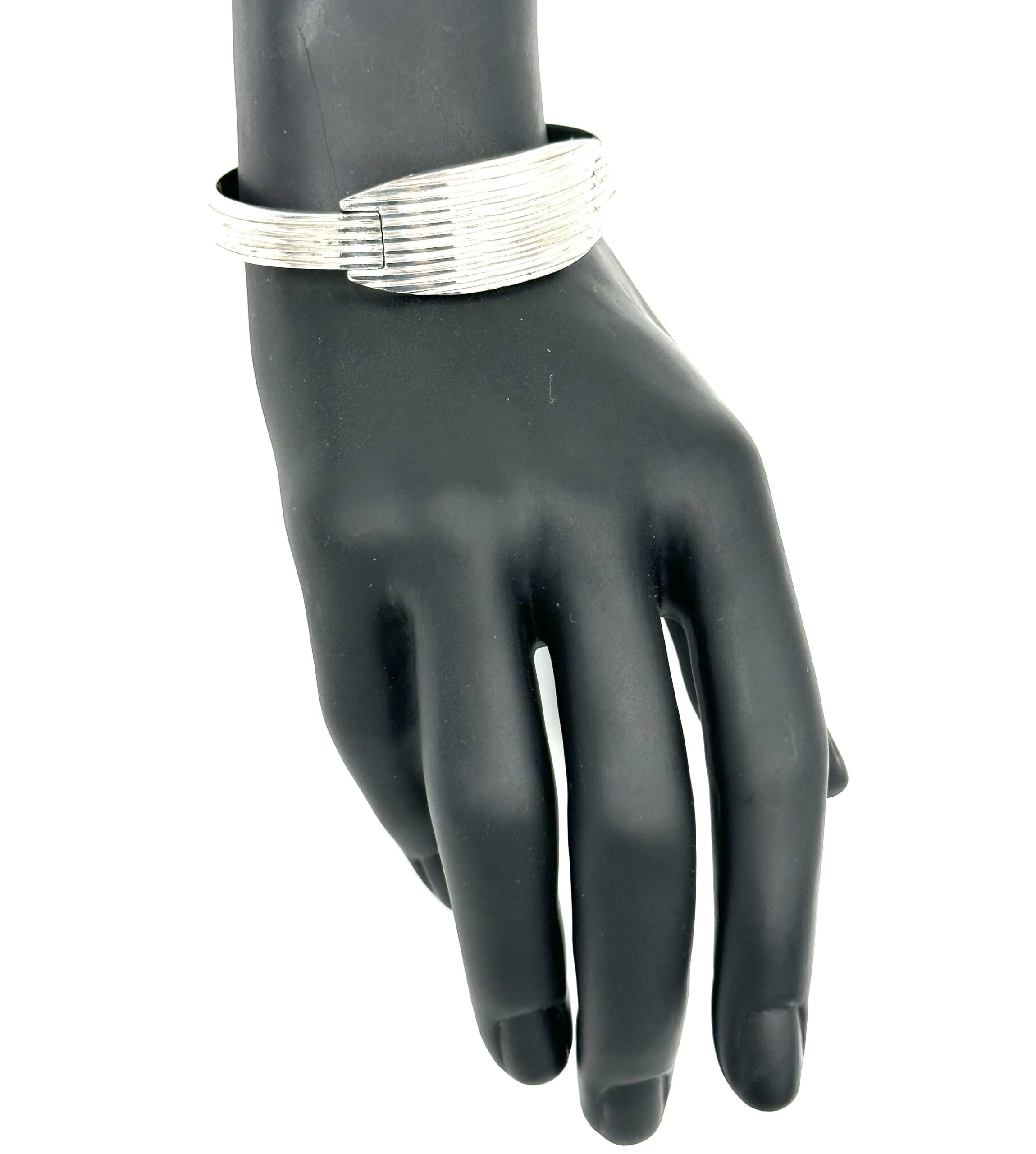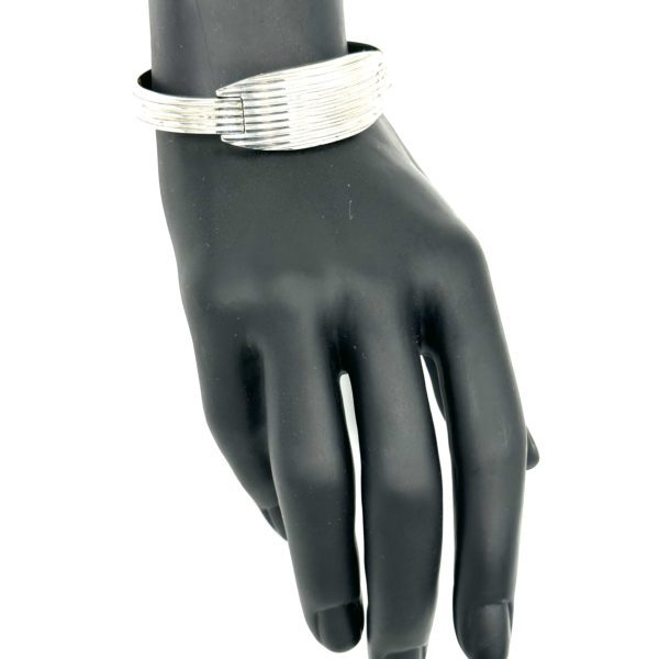 This unique Robert Lee Morris for Calvin Klein Sterling Silver Pressure Bangle #3, is a super clean architectural design that reflects the iconic CK brand ethos. Minimal design, with crisp elegant lines, like his clothes and all his products, this bangle opens by pulling the arms apart gently releasing the arched “door” that lets one put it on nearly any size wrist. The photos below show how there is a gold pin that acts as the lock when the “door is closed and fitted back in place. The entire bangle is made from a finely ribbed silver bar, ridged and textured. The door that opens is curved to add dimension. What a beauty and so classic!