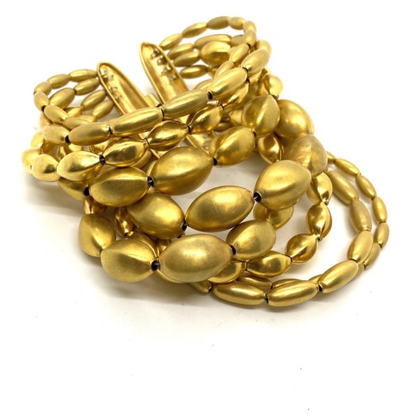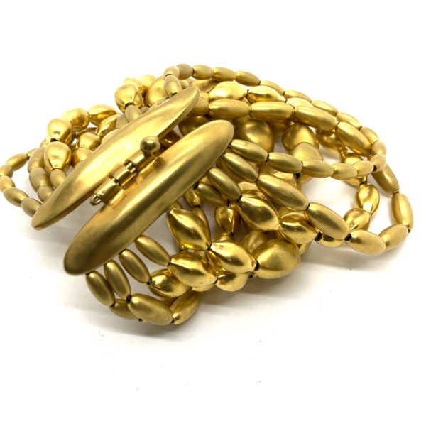Wrists laden with gold beads, the look at many of the DONNA KARAN shows, of which I did 36. 36 collaborations, between 1985-2014! This is one of the bracelets I did, using many sizes of gold plated beads, arranged in parallel lines, held in place by a double slug bracelet clasp.