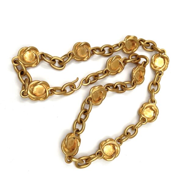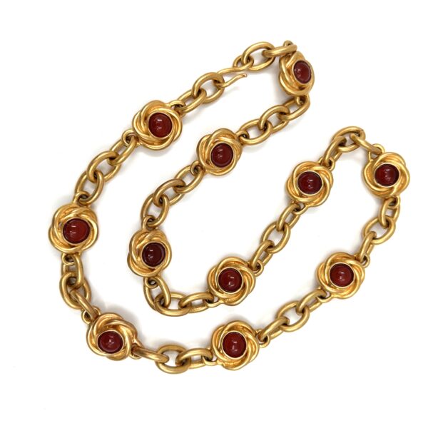 This Robert Lee Morris for Donna Karan Carnelian Knot Belt was made for DK fall collection 1986. Three gemstone colors were used for this fall which were carnelian jade and black onyx. The =csarnelian cabochons were set into gold-plated brass knot-like settings, and linked with heavy ovalized chain. Worn by very thin models on the runway, the belt is 31.5″ long and can be worn as a necklace as well.