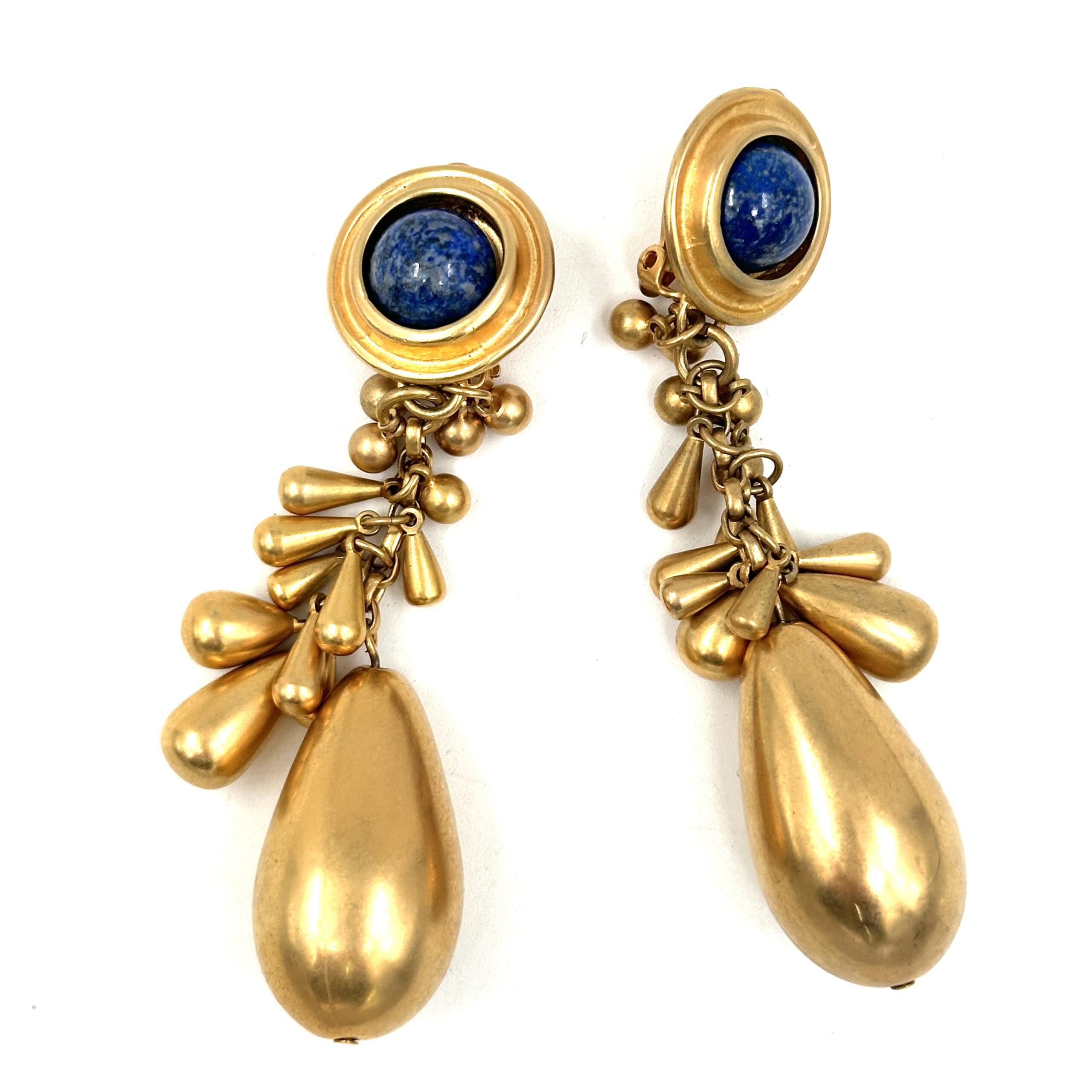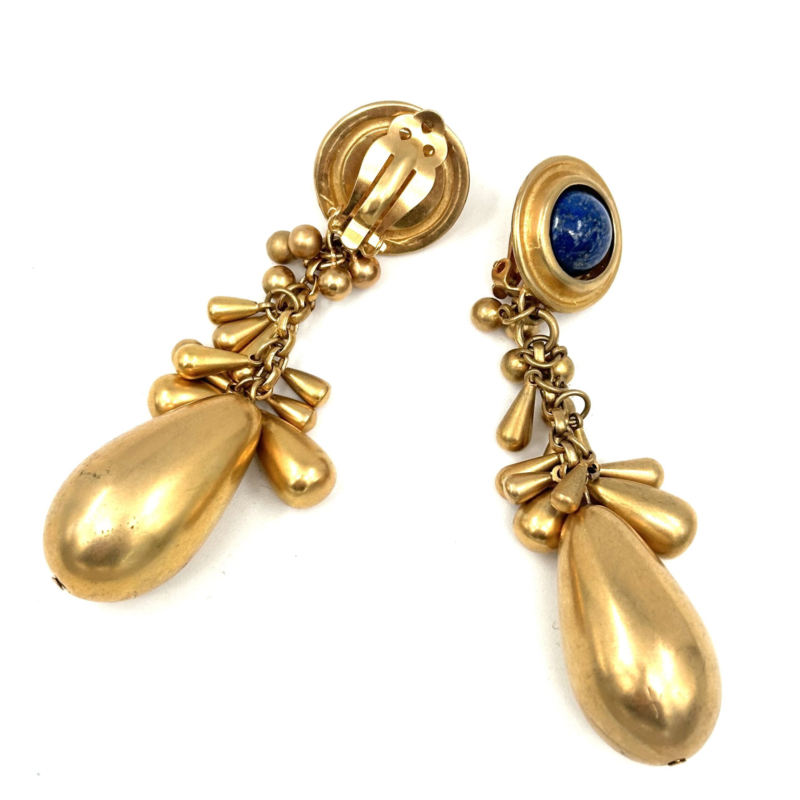 These elegant Robert Lee Morris for Donna Karan Dangling Bat Earrings are luxuriously long and sexy. Gold-plated brass components with Sodalite cabochons make this long-drop chandelier style glow gloriously, and the many tiny dangling teadrop shapes give it an unusual character. Drapy and sensuous these earrings are great for evening and fancy affairs.