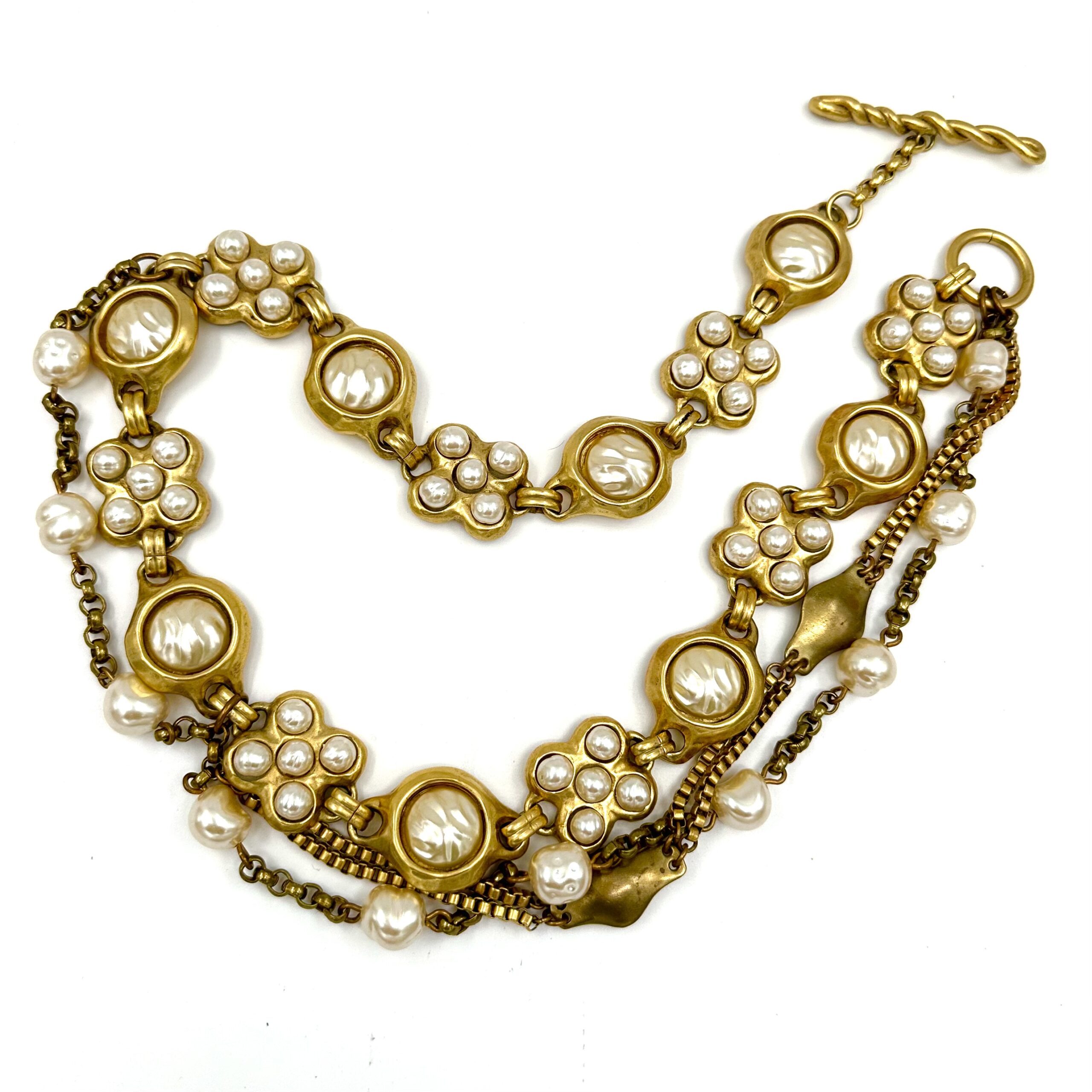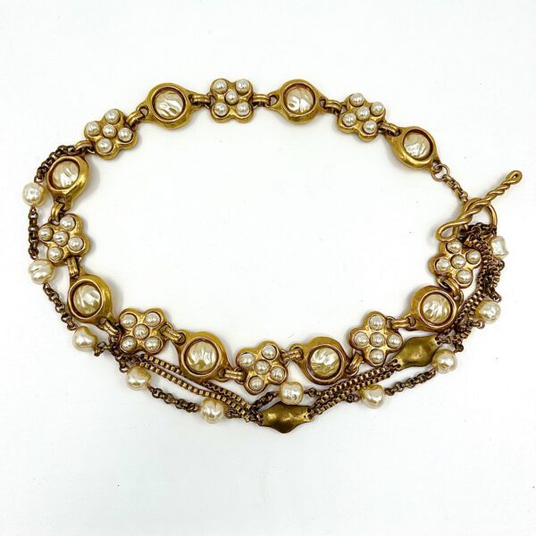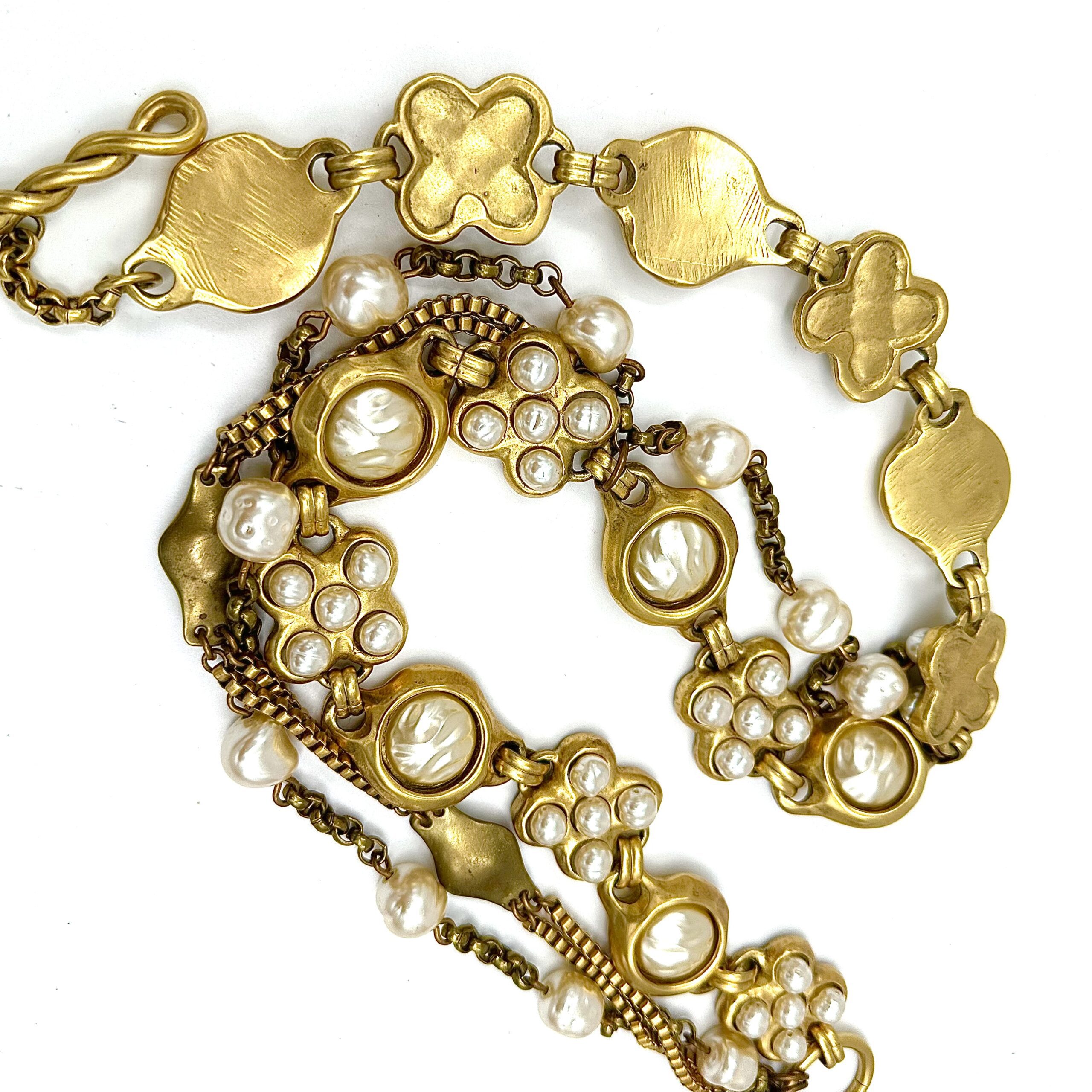 This Robert Lee Morris for Donna Karan Deluxe Jeweled belt is divine fashion. Created in the late 1980’s, this luxurious pearl encrusted belt is made with chunky solid brass castings that are gold plated. The pearls are antique French glass pearls  and there is a constructed drape which was an iconic theme in the DK collections. The closure is a large twisted wire toggle that goes through a large loop at one end of the belt. 29″ long, with a 3″drape.