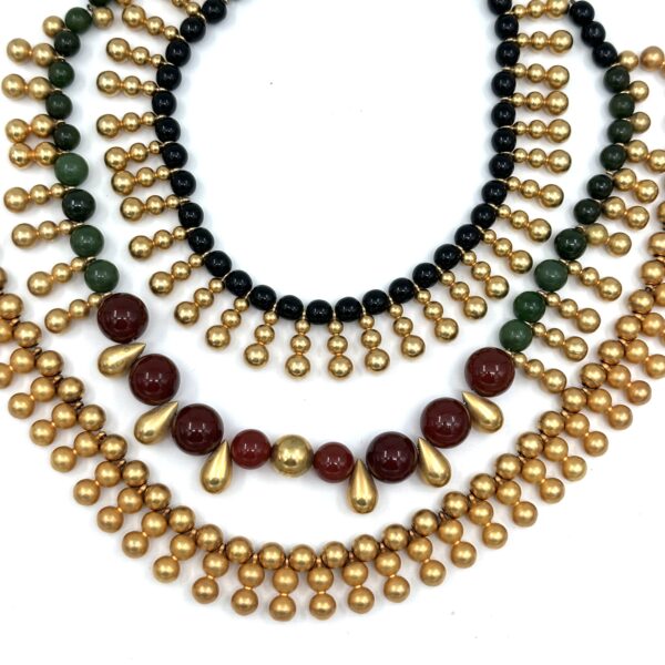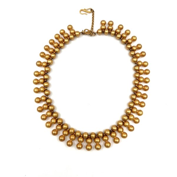 This Robert Lee Morris for Donna Karan Gold Caviar Burst Necklace is from the 1986 DK fall collection. It was a smashing hit, both for the clothes and the jewelry. This is a classic gold plated brass Cariar Burst necklace, with double-ball “drops”. This one has an adjustable length, with the 3″ chain extender. Perfect classic wear-forever style.
