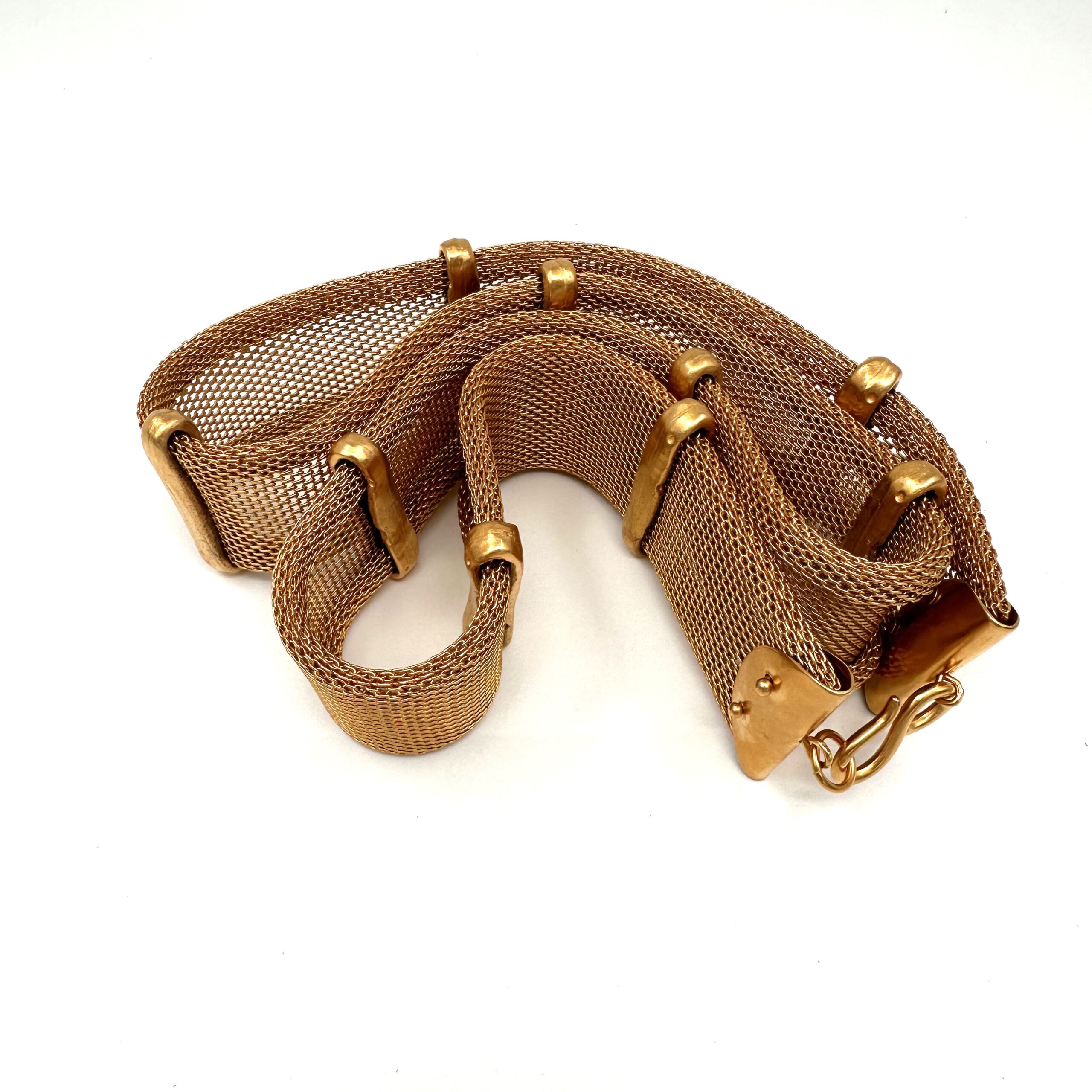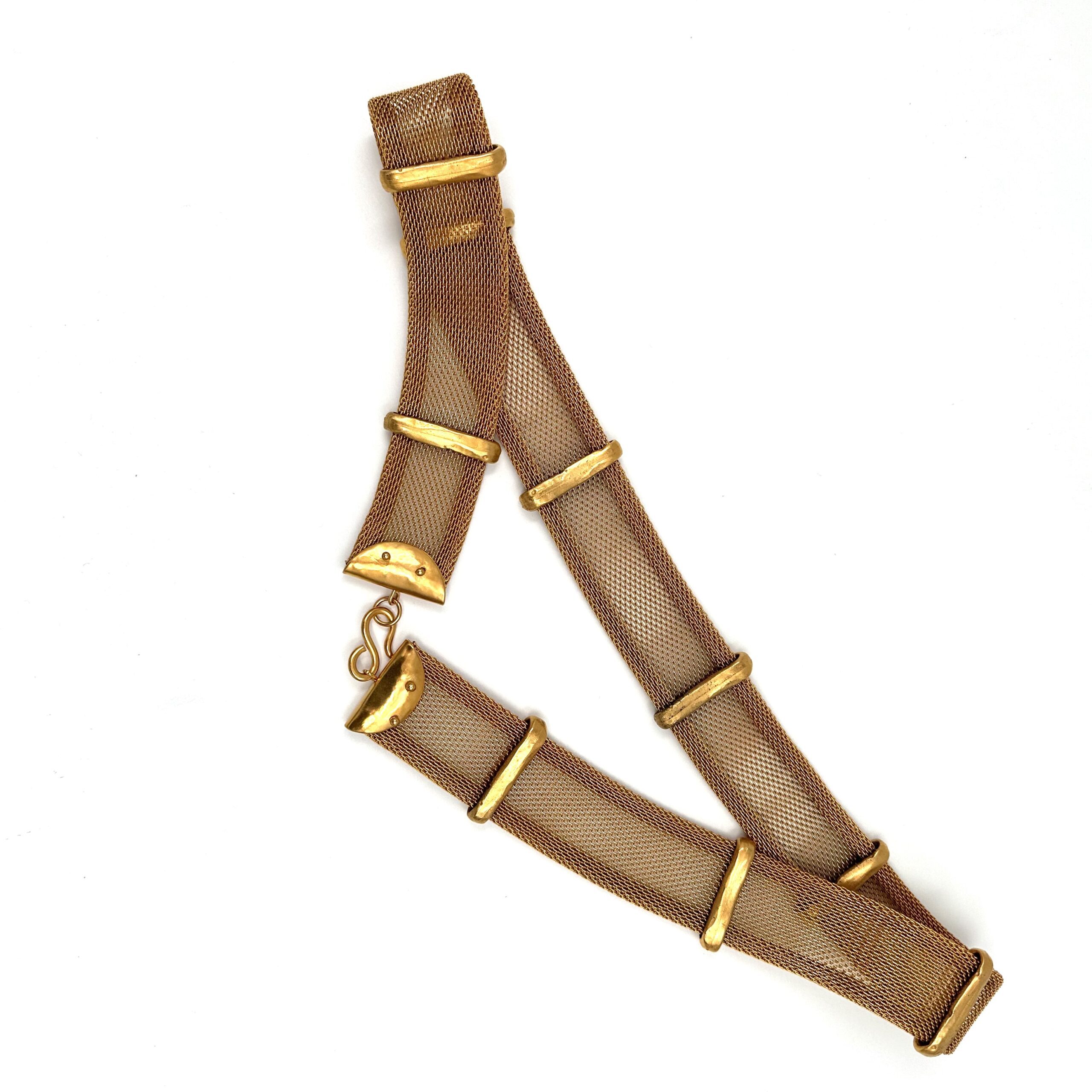 This rare handmade Robert Lee Morris for Donna Karan Gold Mesh belt has 9 chunky “ribs” that encompass a gold plated mesh belt, with a hook and loop clasp. It is 10.1 oz, and measures 37″ long. A collector’s find for sure!