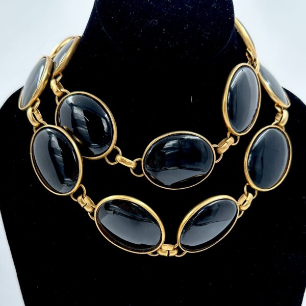 This rare Robert Lee Morris for Donna Karan Jumbo Black Onyx Necklace is spectacular in its boldness and simplicity. The very large oval cabochons of black onyx are set into thin gold bezels in an 18″ long necklace. Created for the 1988 collection the three gemstone colors that accentuated this collection were black onyx. carnelian and green jadeite. There is another necklace almost identical with afew smaller stones but the two pieces can be purchased seperately and worn together for dramatic effect as shown in the thumbnail shots. the necklace is directly from the runway and is signed by the artist.