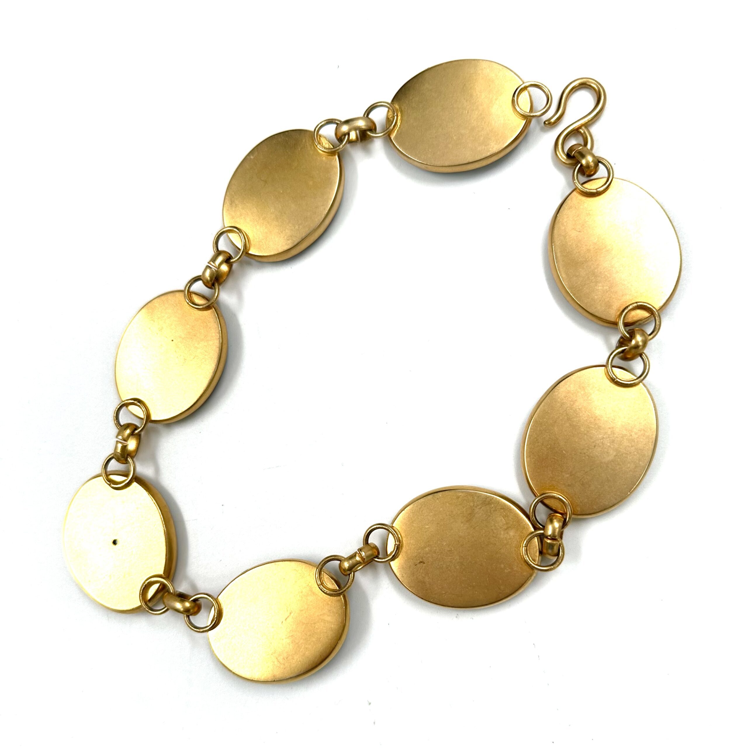 This rare Robert Lee Morris for Donna Karan Jumbo Black Onyx Necklace is spectacular in its boldness and simplicity. The very large oval cabochons of black onyx are set into thin gold bezels in an 18″ long necklace. Created for the 1988 collection the three gemstone colors that accentuated this collection were black onyx. carnelian and green jadeite. There is another necklace almost identical with afew smaller stones but the two pieces can be purchased seperately and worn together for dramatic effect as shown in the thumbnail shots. the necklace is directly from the runway and is signed by the artist.