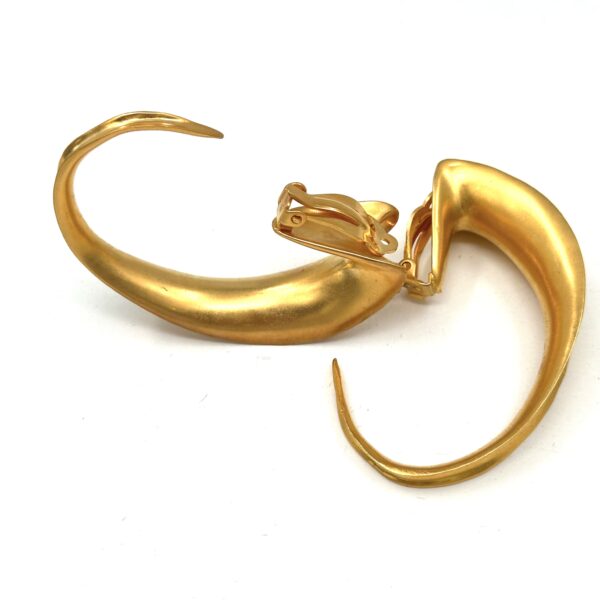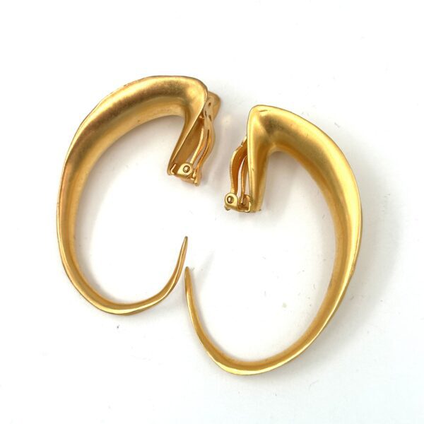These Robert Lee Morris for Donna Karan Lg Scoop Hoop Earrings are large bold dramatic gold hoops from the late 1980s. The dynamic swoop of these sculptural earrings is what fashion editors everywhere love to shoot for their pages. Clip-ons, these are much lighter than they look, due to the thinness of the castings, and the balance. The long curve of concave gold and the reverse convex side are typical Morris form. Classic, iconic, and fun to wear, these are some of the most exciting designs ever for the DK runway.