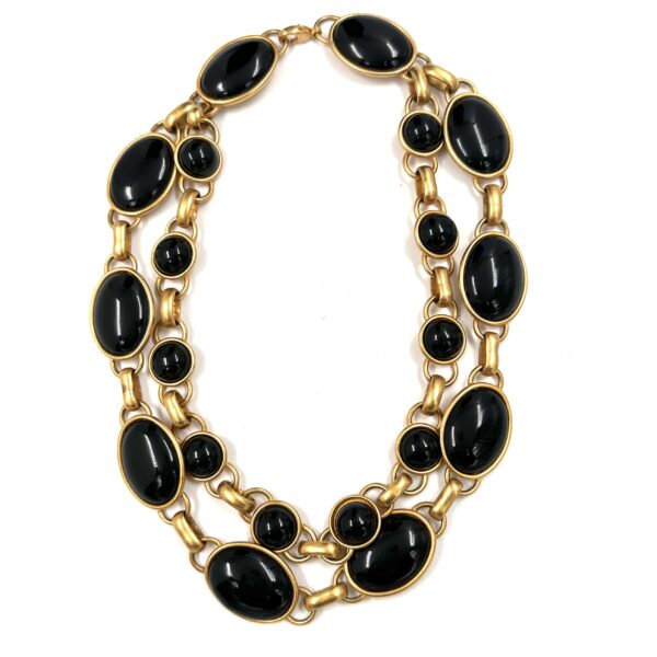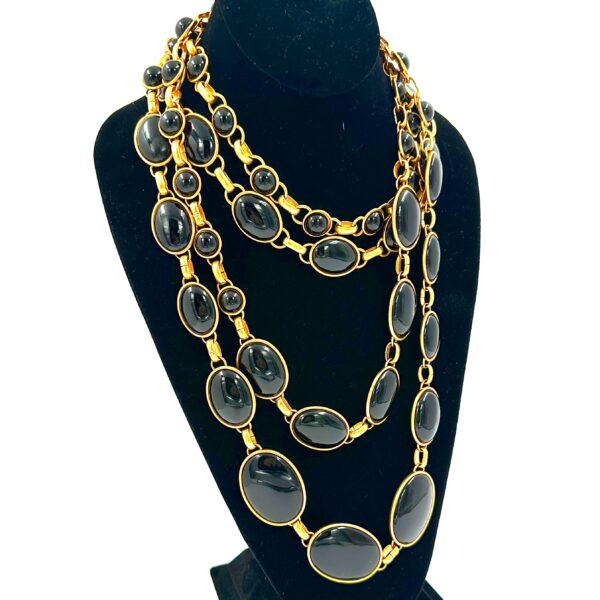 This Robert Lee Morris for Donna Karan Nesting Black Onyx Necklace is directly off the runway and in pristine shape. Made for the 1988 DK collection, the black onyx was used as an accent in the show, and came in a variety of lengths. This one has one row of small round cabochons nesting inside a longer and larger strand of bigger onyx stones. It sits perfectly around the neck at 16.5″ and is ultra modern and classic.It is shown on the neckform below nesting within the long 52″ black onyx strand.
