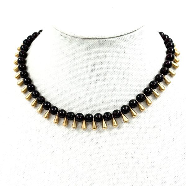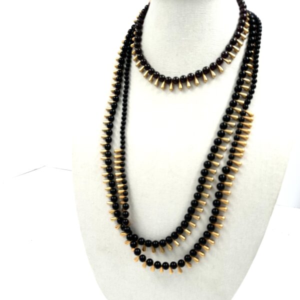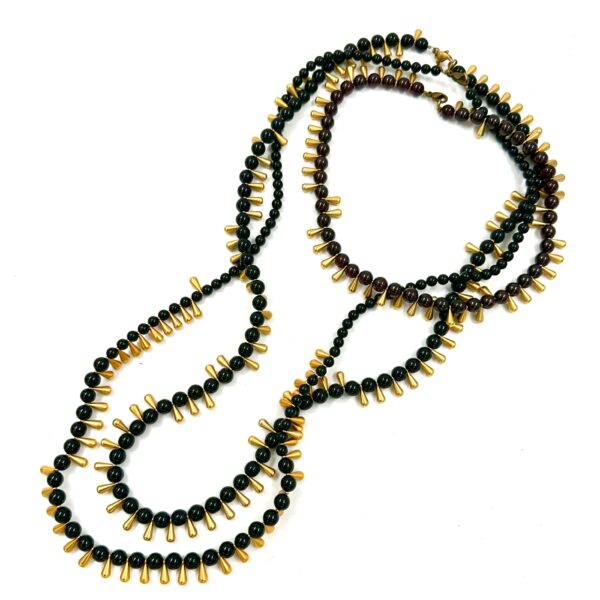 This Robert Lee Morris for Donna Karan Onyx and Gold choker is 16.5′ long and meant to be worn by itself or with two other similar styles that are much longer.