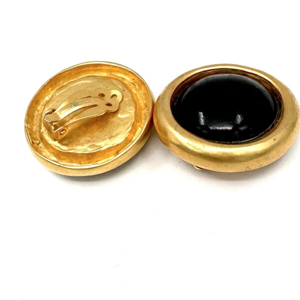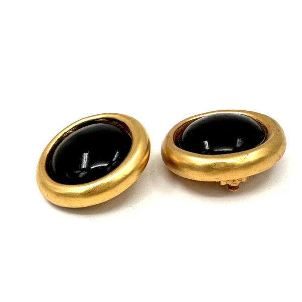 These Robert Lee Morris for Donna Karan Onyx Button Earrings are simple and bold. Â A large genuine black onyx cab sits in a bold gold bubble rim setting, and are classic forever in style. The black and gold accent is a must in all modern wardrobes. Sizable, as was the look in the 80s, these simple buttons have quite an impact.
