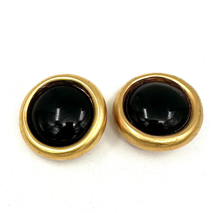 These Robert Lee Morris for Donna Karan Onyx Button Earrings are simple and bold. Â A large genuine black onyx cab sits in a bold gold bubble rim setting, and are classic forever in style. The black and gold accent is a must in all modern wardrobes. Sizable, as was the look in the 80s, these simple buttons have quite an impact.