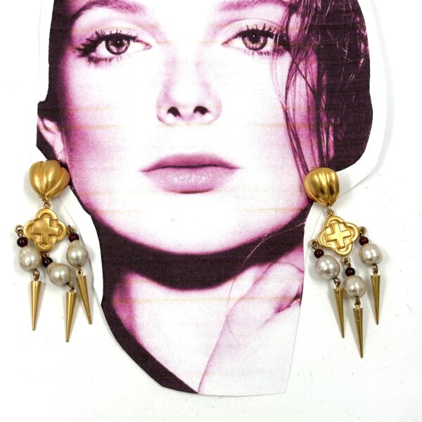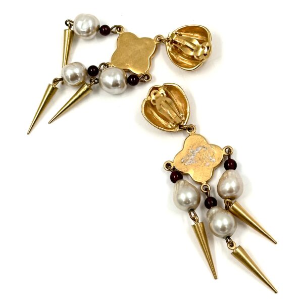 These Robert Lee Morris for Donna Karan Pearl & Garnet chandelier earrings are dramatic and romantic. They were from the 1988 spring collection. Clip-on style makes them easy for the runway process, large earrings with strong clips make them secure.