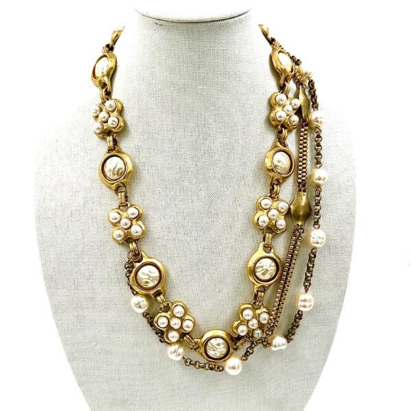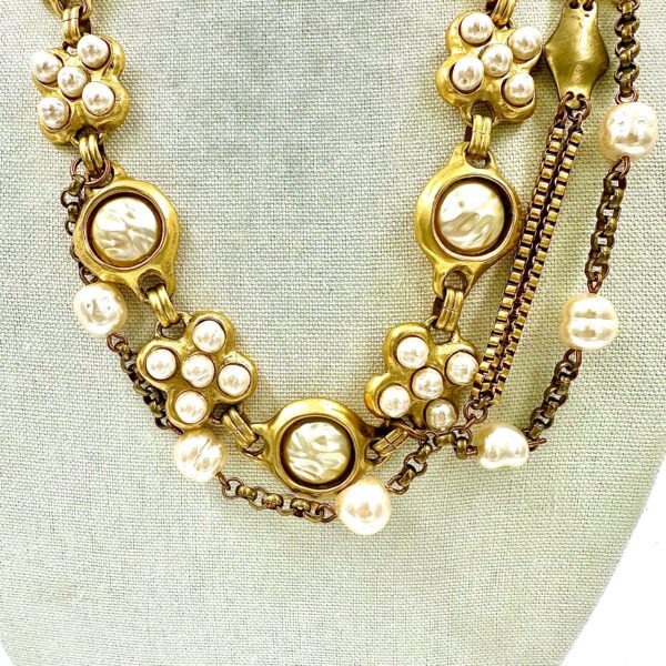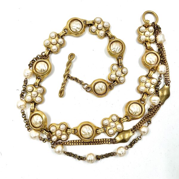 This one-of-a-kind Robert Lee Morris for Donna Karan Pearl & Gold Belt comes right off the runway of her 1988 Spring collection. At 28.5″ long, it can be worn as a belt (if you are a model size) or a powerful necklace as shown. There is a draping chain that adds a sexy touch to this dramatic piece. The French glass pearls set into the iconic gold plated brass forms are a perfect example of the unique collaboration between Robert nd Donna.