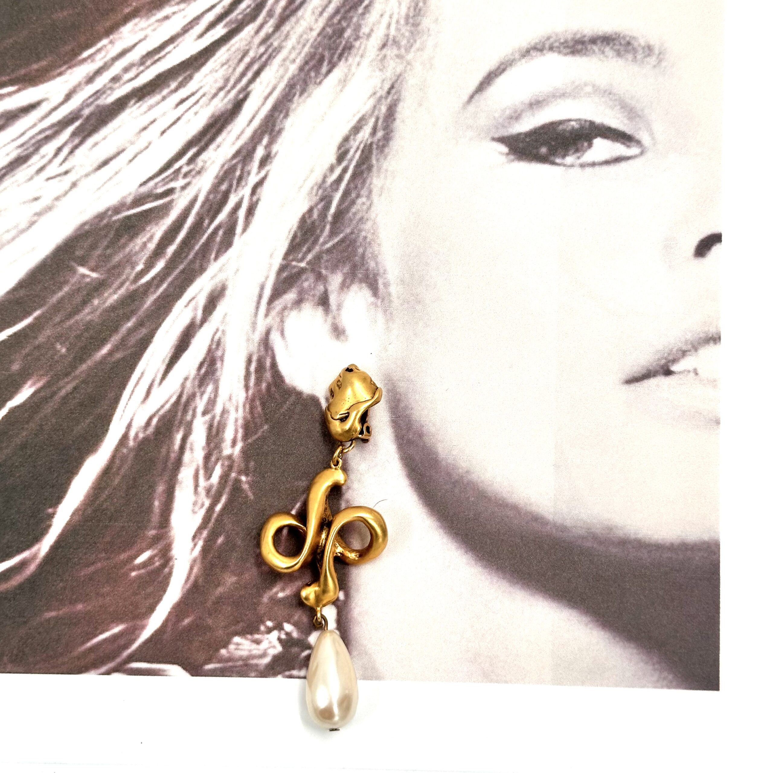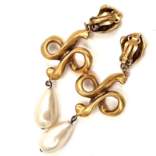 These straight off the runway, Robert Lee Morris for Donna Karan Pearl/Knot Chandelier Earrings. 1988 may have been when Morris did the Donna Karan collection that needed a huge gold and pearl structure, following in the brash footsteps of Lagerfeld at Chanel in the late 80’rass and faux pearls.s. It was a spring collection of lightweight looks and lots of whites. The pearls looked perfect. Gold plated brass and faux pearls. Clips