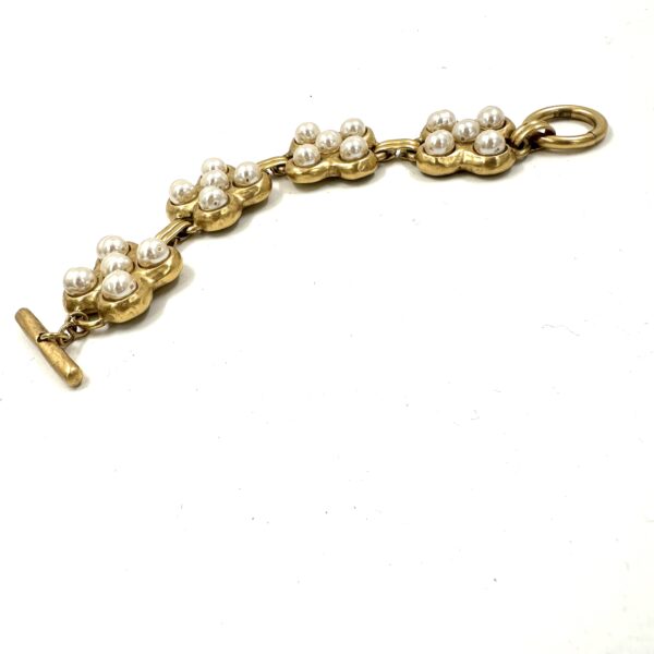 This gorgeous Robert Lee Morris for Donna Karan Pearl Link Bracelet is a classic elegant look that was part of the 1988 Spring collection. Four organic square forms, each with 5 glass pearl inset, are linked and finished with a toggle closure.