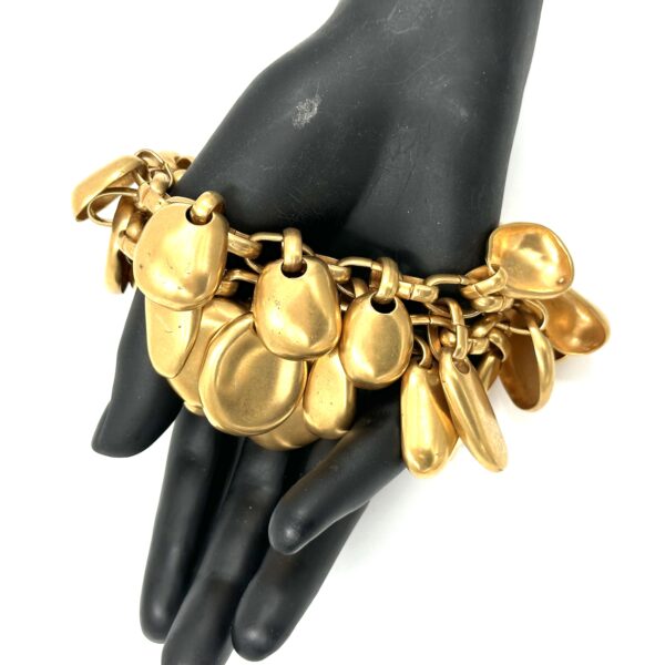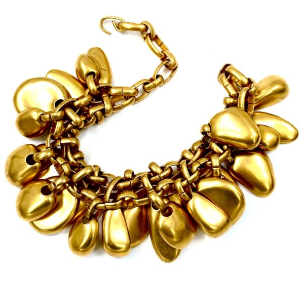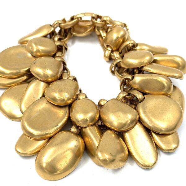 This Robert Lee Morris for Donna Karan Pebble Charm Bracelet is an over-the-top fashion statement! Gold plated pebble forms, (hollow) are assembled in overlapping clusters from a grid of chain mesh and is adjustable size-wise. The chain pulls through a loop and can be tightened and clasped where it fits best. This bracelet so charmed our customer Bianca Jagger that she bought a pair of them for her super tiny wrists.