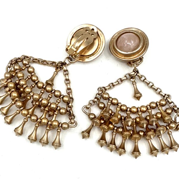 These Robert Lee Morris for Donna Karan Rose Quartz Chandelier Earrings are a very unusual style for Morris to make. The delicate work that hangs below the Rose Quartz top is a three row construction of overlapping tiny gold plated brass drops. They swing on a chain and are most original in concept. Clip ons, they are dramatic and chic. The color of the gold plating for this season was a soft rose gold.