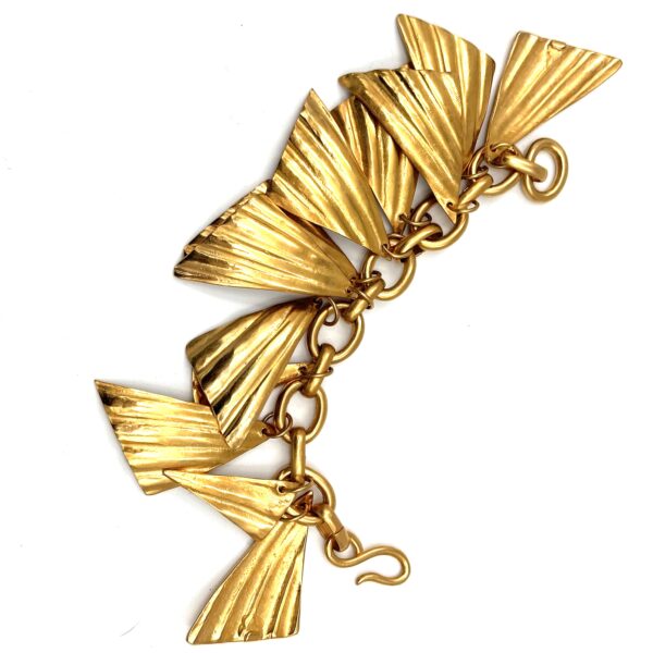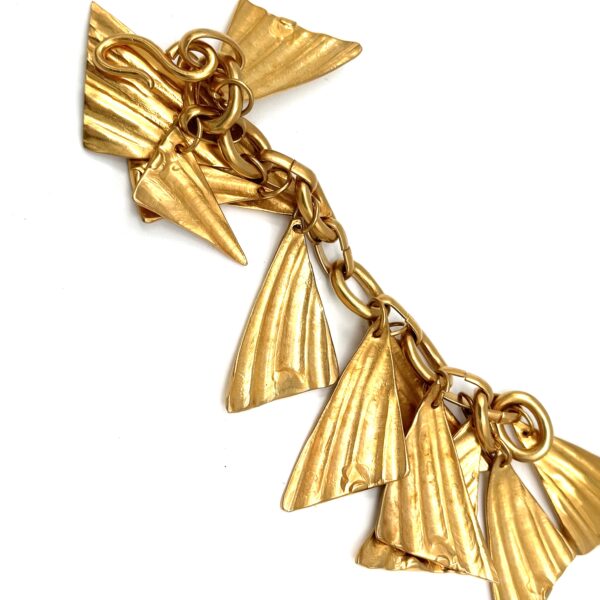 This Robert Lee Morris for Donna Karan Shell Charm Bracelet is constructed of brass triangular shell forms that are drenched in 24k gold plate. The shell form was created by taking wax impressions from actual sea shells, so there is actual shell surface definition. they hang from a bold chunky chain of thick oval rings. Donna loved gutsy charm bracelets that would jangle underneath her jacket sleeves. The clasp is a simple large hook that can be placed wherever the fit is needed.