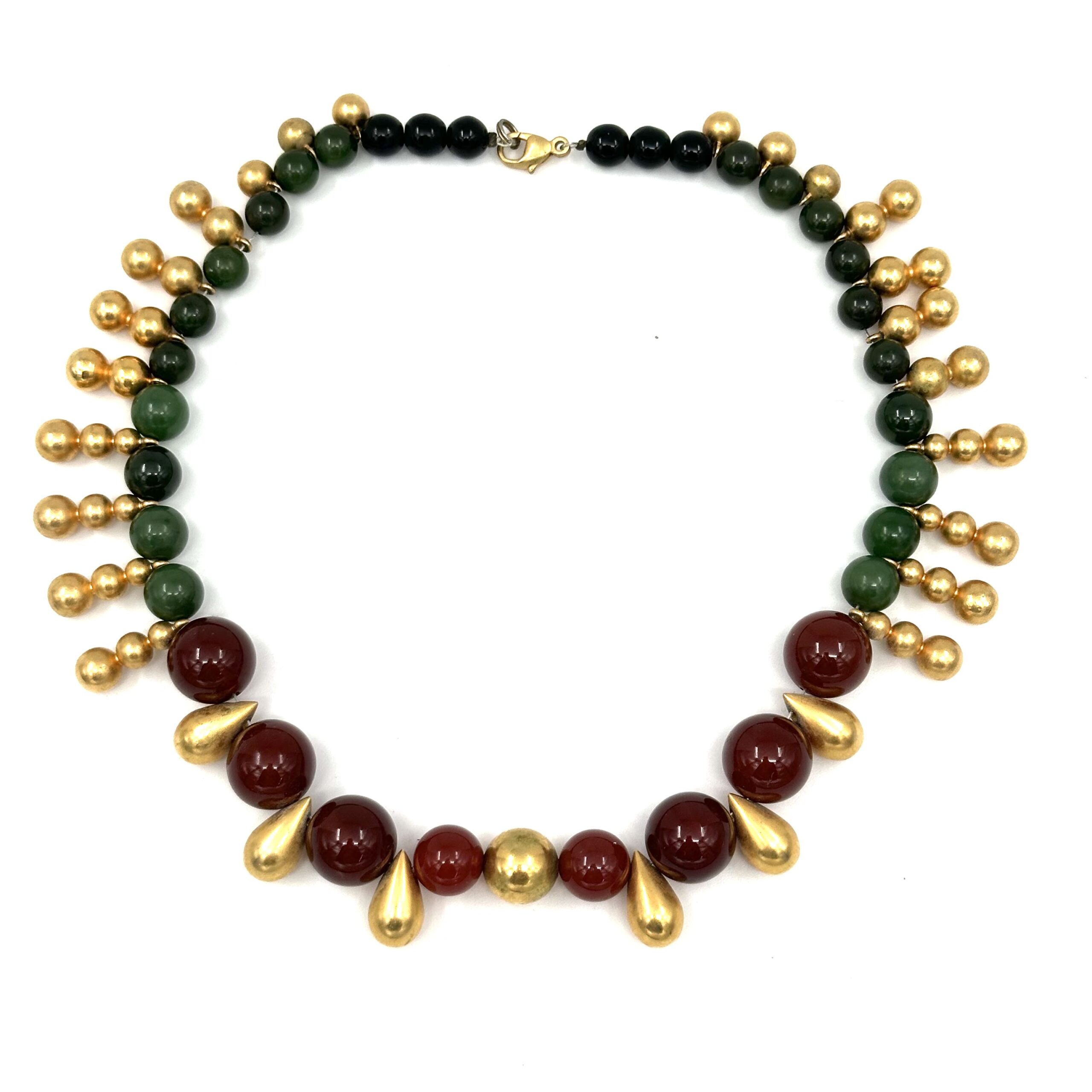 This is a rare one-of-a-kind Robert Lee Morris for Donna Karan Tri-color Caviar necklace created for the DK fall 1986 collection. It features large carnelian beads, jadeite and onyx beads, and gold-plated drops and beads. The main colors of the jewelry for this season was carnelian red, jadeite green and black onyx all embraced with 24k gold.