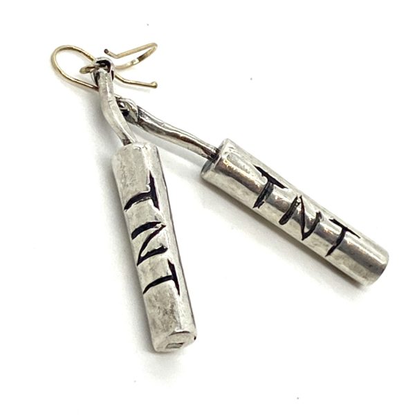In 1994, I had a license with WARNER BROTHERS to create silver jewelry and leather accessories for their newly born retail shops. This piece is from the Looney Tunes collection, ( and is a major piece of carving I have to say). I love carving wax, and enjoyed making this entire collection of characters and faces. These dynamite earrings with 14k gold wires, are Coyote’s fave tool of destruction. Sterling silver