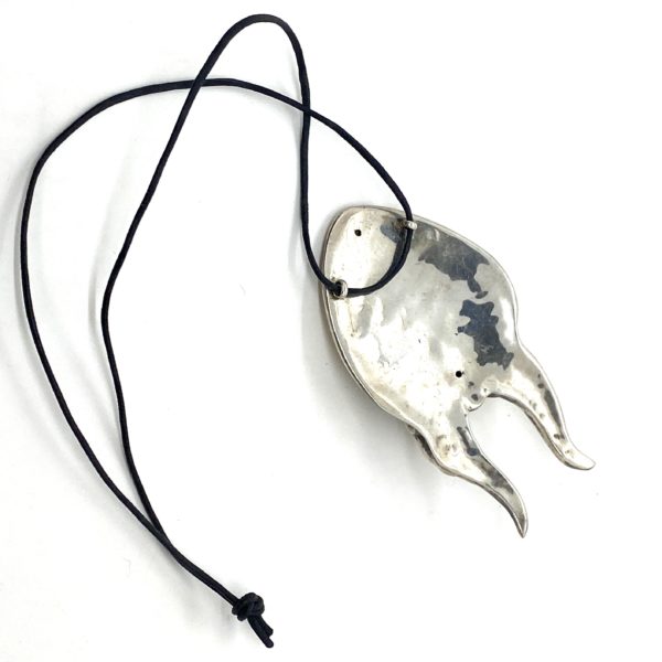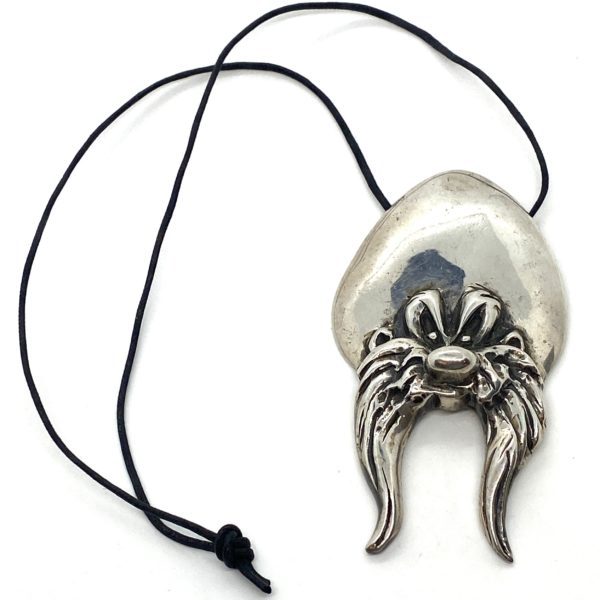 The Yosemite Sam pendant is glorious in its scale and presence, (at once shocking and then also a laugh pops up). It is a major piece of sterling silver weighing  over 3 oz and measures 4.5″ long x 2.5″ wide. It was also meant to accompanying 6 silver pistols arranged into a funny Squash Blossom necklace, a rare piece that I do not have in my archive library.  Sam can be worn on a wide variety of cords or metal rings, etc.