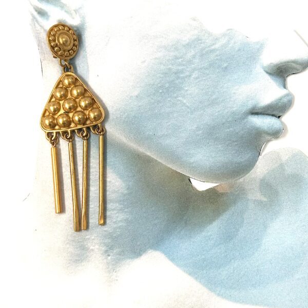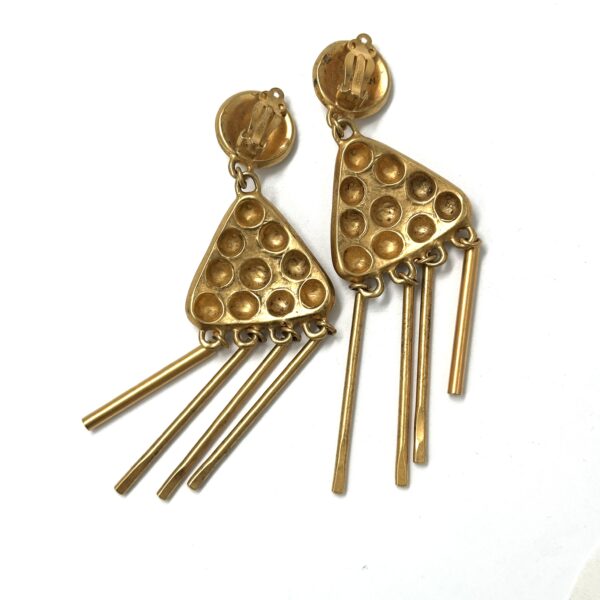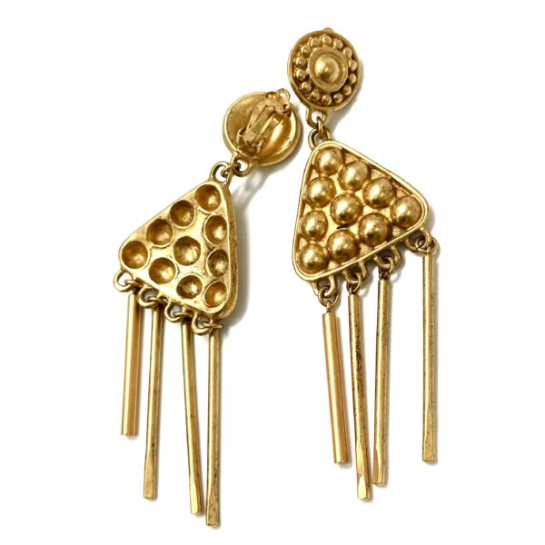 These rare Robert Lee Morris Gold Chandelier Earrings were designed for the Spanish luxury company Loewe in 1994. Morris had a design contract to work with this company to design jewelry and hardware for them. The use of little half balls, or bumps was a tribute to Spanish armor. Clip-on earrings and very sexy to wear AT 4″ long and free swinging fringe.