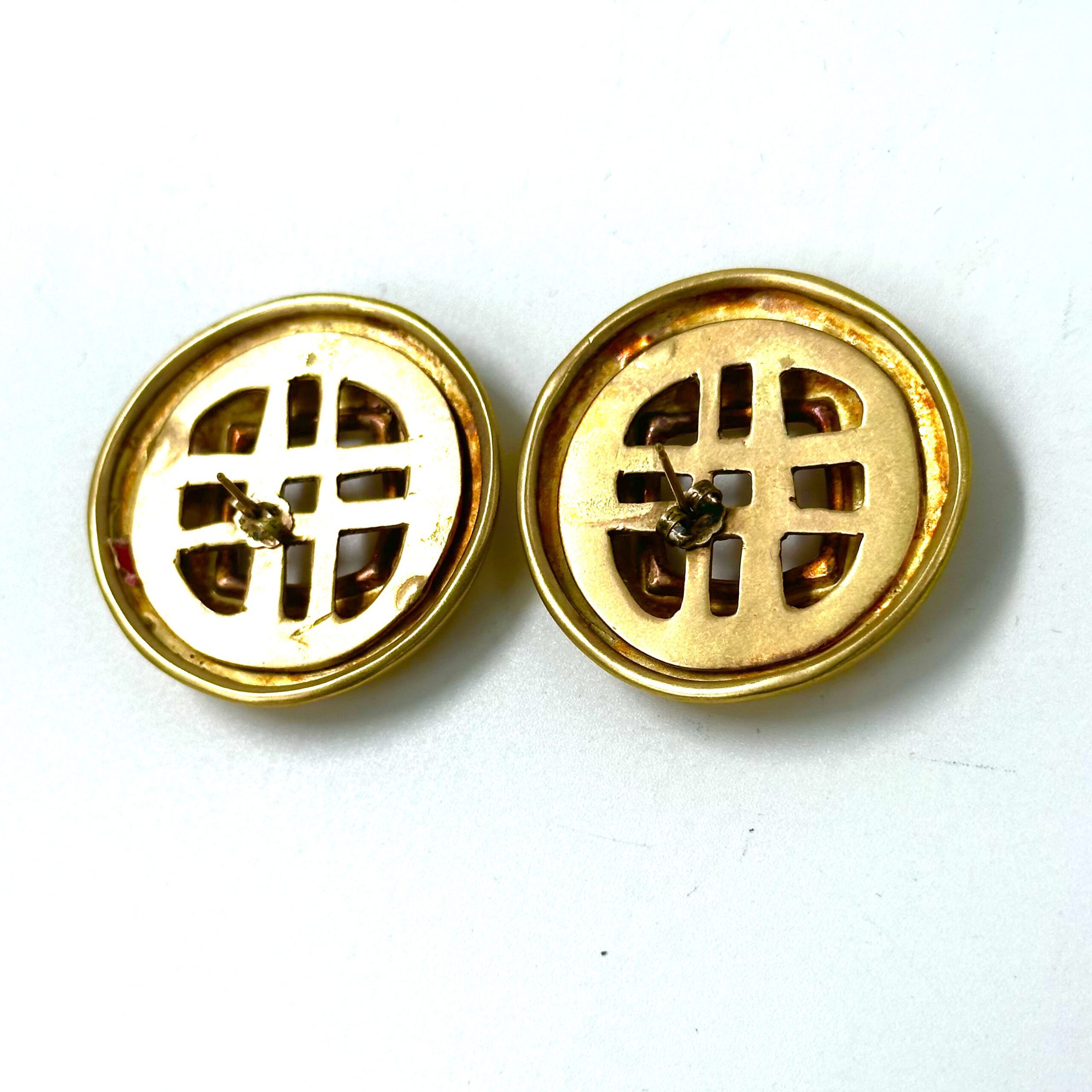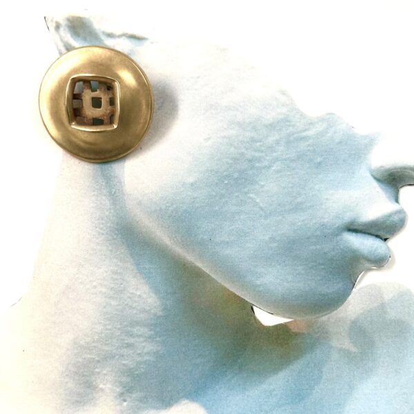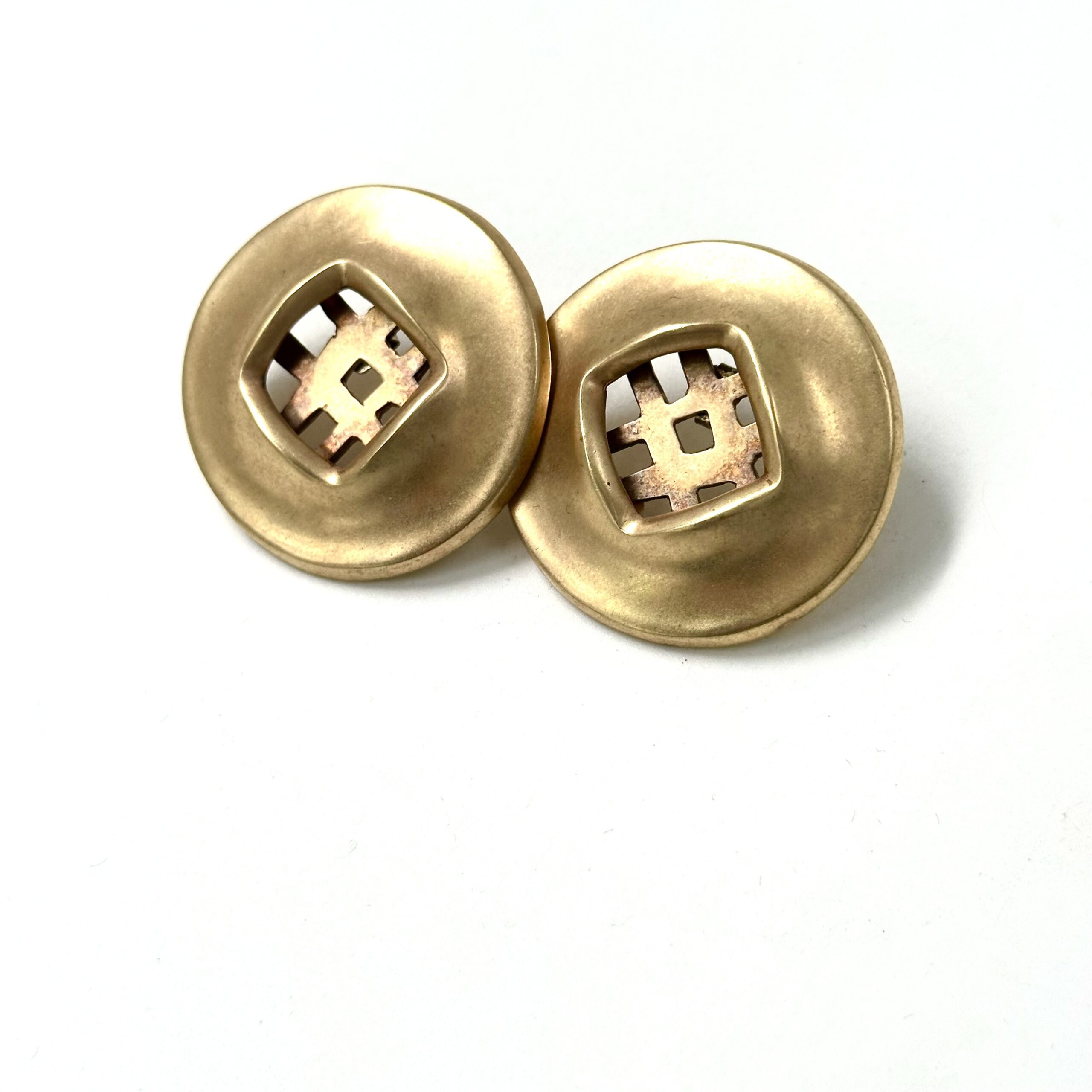 These vintage, one-of-a-kind experimental Robert Lee Morris Gold Checkerboard Backed Coin Earrings are from 1983. The unusual thing about these sculptural earrings is the use of the gridded patterned sheet that is the earring back. Rare and yet still iconic due to the voluptuous edge around the sheet metal form. these are with 14k posts.