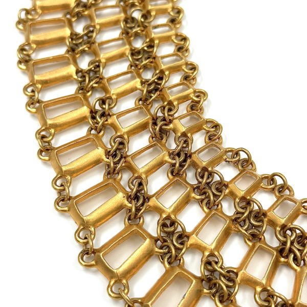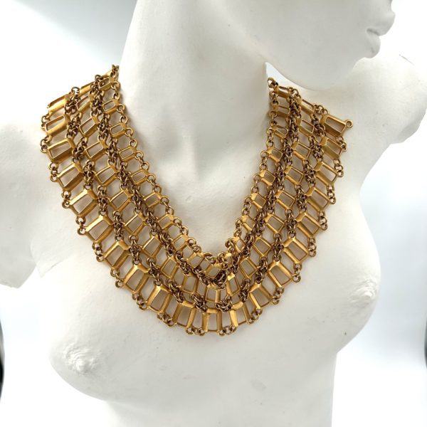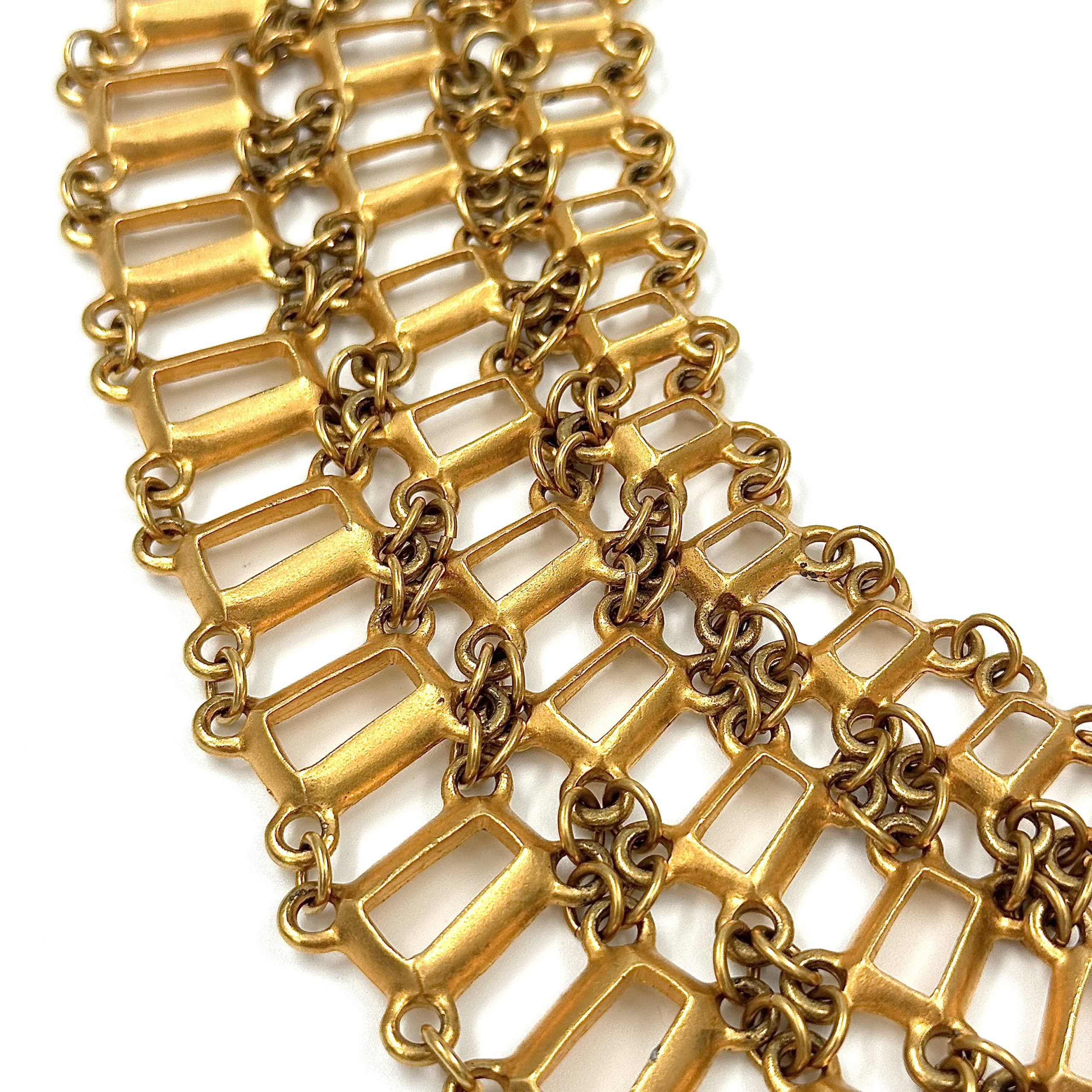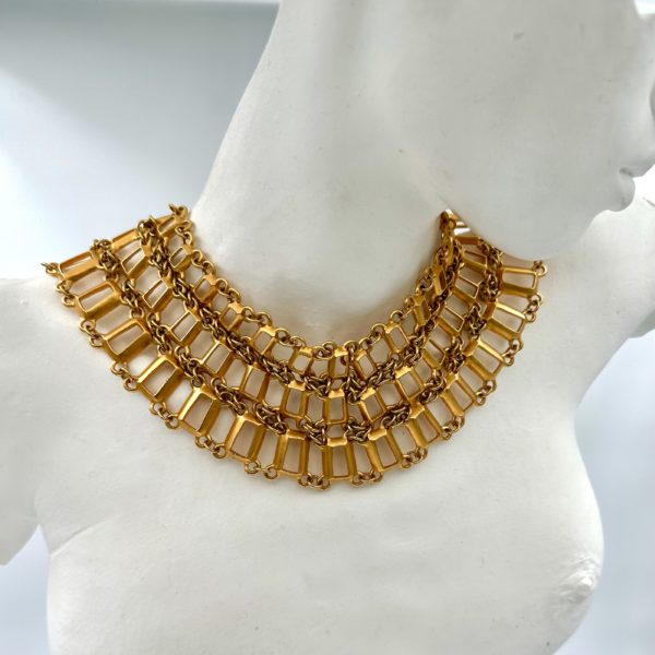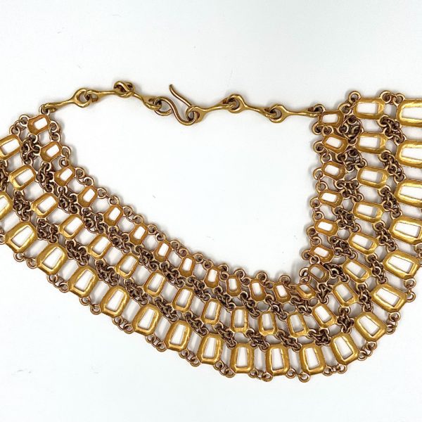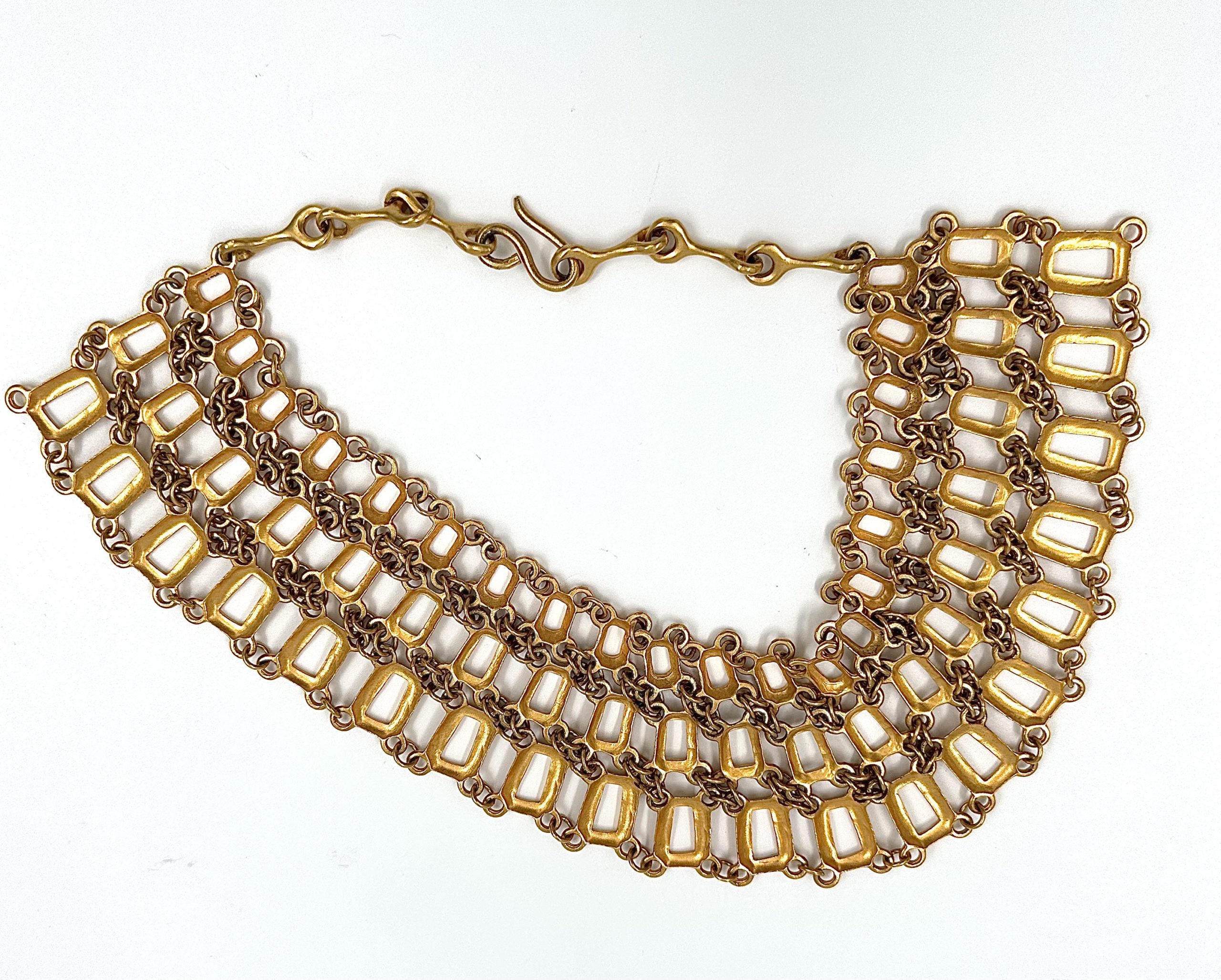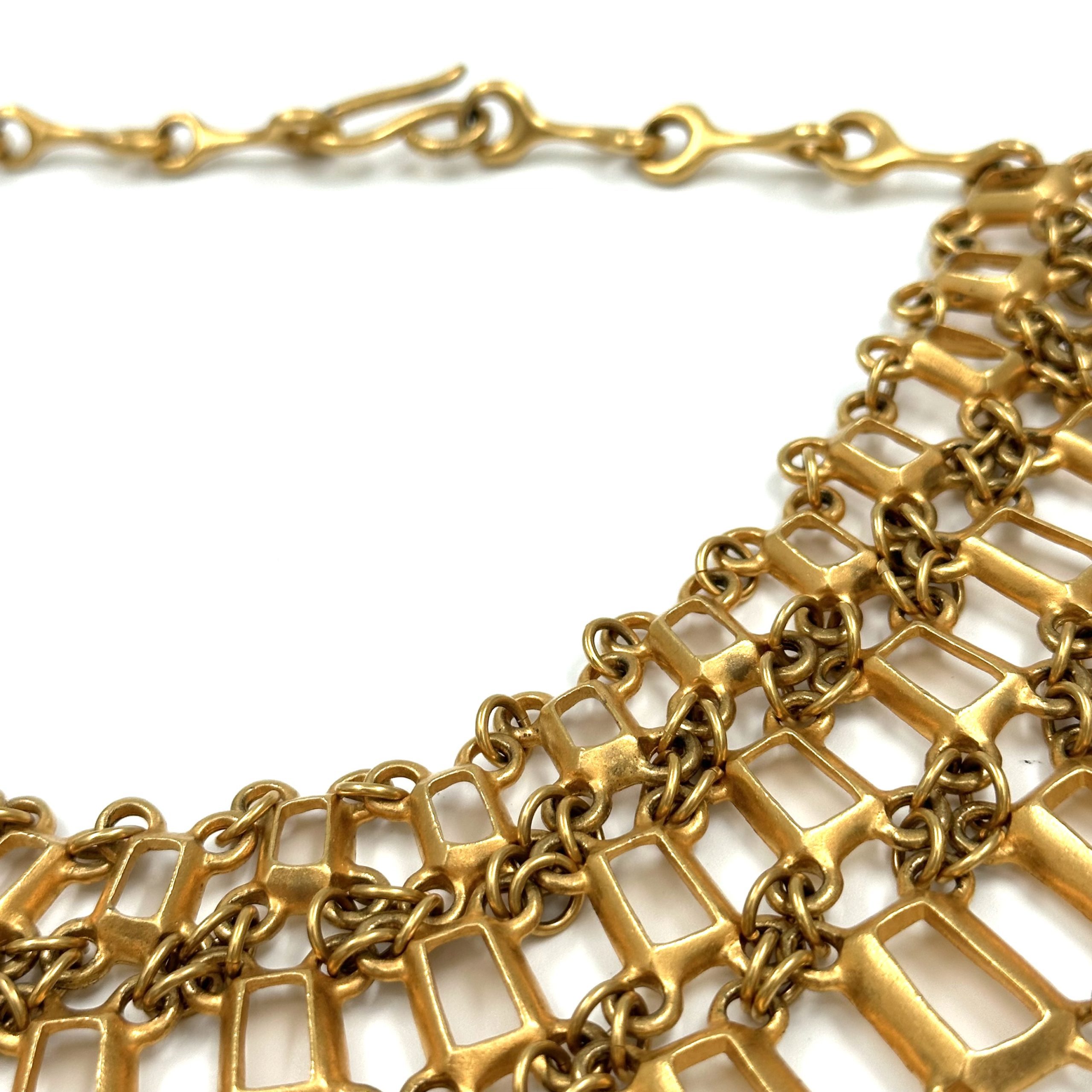 The Robert Lee Morris Gold Plated Brass Egyptian Collar, was designed for Donna Karan in silver tones, but this one is a special gold plated version. The one of a kind prototype has a uniqued addition of a twisted loop chain giving the piece size flexibility. Like a cobweb of gold, this is a classic and forever chic necklace, bound to stun people at parties, and add major power to ones look.