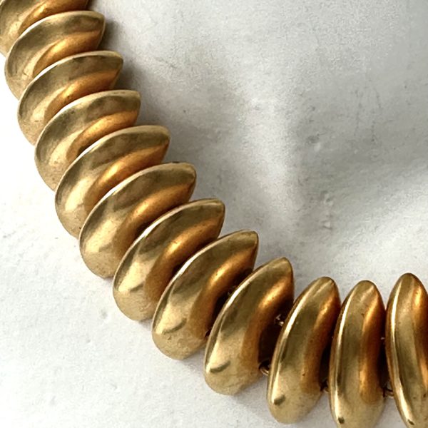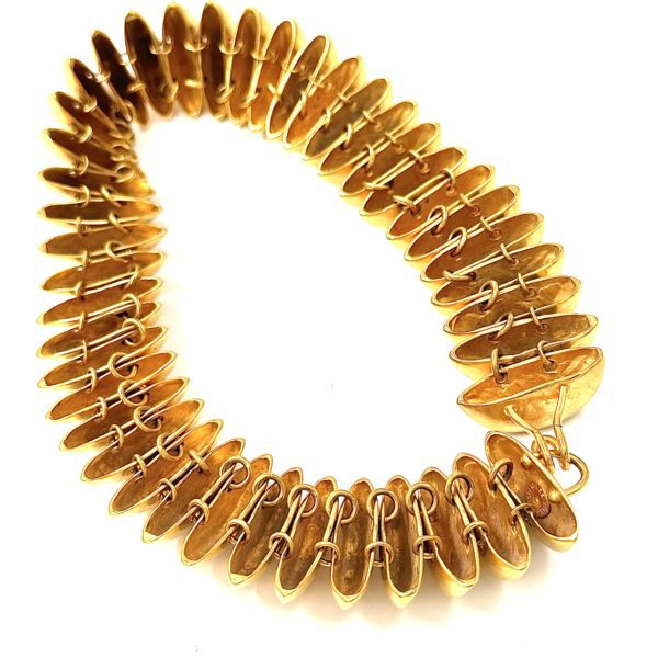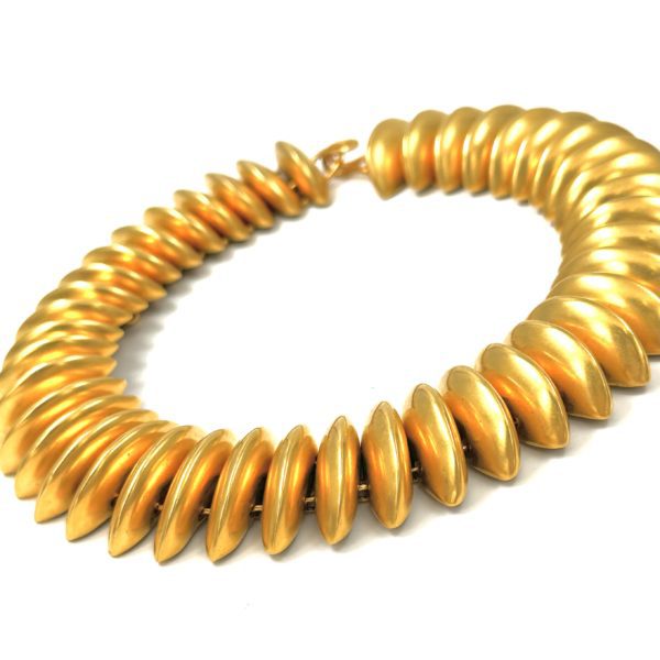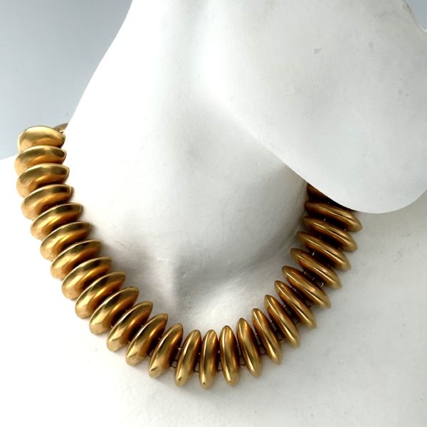 This vintage Robert Lee Morris Gold Plated Caterpillar Choker Necklace is so slinky and playful. Liquid Geometry is what Morris calls his organic fluid work, making metal jewelry fall softly around the human body like it was part of it. This short necklace at 14.5″ is for a small neck. Most of his active carer, Morris was very often around tall thin models and used their general measurements for his jewelry. This is a choker, sitting at the base of the neck in the most dramatic way. The link lanky nature of this piece is so much fun to wear. Looking at the backside of the piece one can see how by using smaller jump rings at the top than the larger ones at the bottom made the necklace lie in a natural curve. See the detailed image of the back of the piece in the gallery shots. Each casting is a beveled sharp dome, or mound of metal, which creates the look of all the pieces leaning forward as they race around the neck.