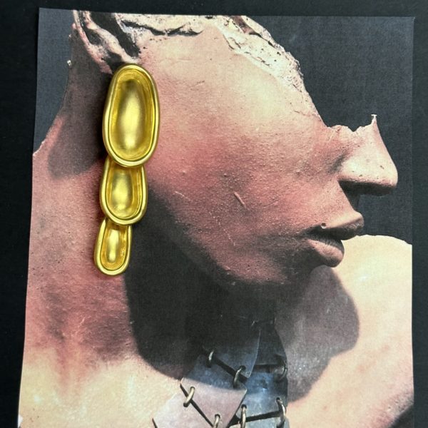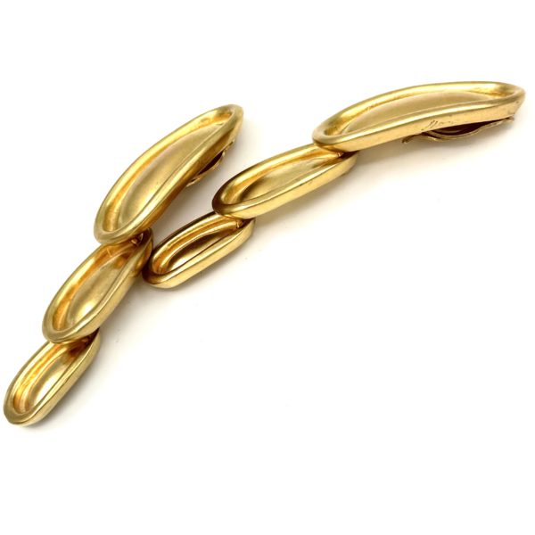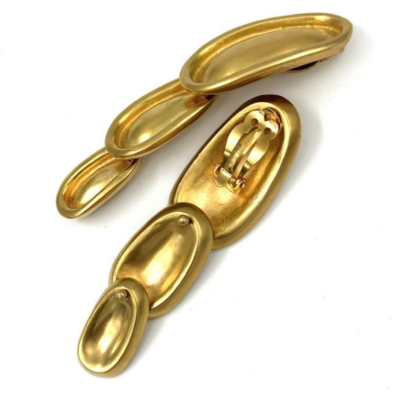 This pair of spectacular Robert Lee Morris Gold Plated Chandelier Drop Earrings is a favorite of fashion editors. Perfect for the runway these long sexy earrings are quite bold and long. The scale is typical of Morris’ dramatic earrings and what helped define the 1980s fashion look in NYC. Cllip ons, because runway earrings need a quick change for the models, these are actually comfortable to wear for a party or evening out on the town. The three ovalized forms, are tapered in size and held together by a rivet pin in the back that allows for kinetic movement as see in the photo gallery. The prominent wire edge makes these earrings an unusual departure from the typical Morris construction, where the wire is prominently on the back.