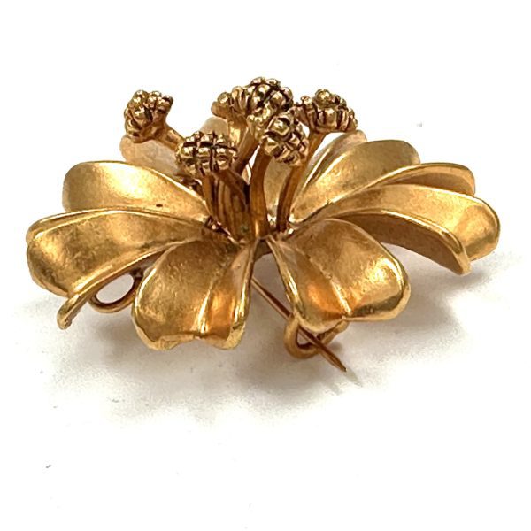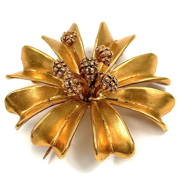 This Robert Lee Morris Gold Plated Crazy Flower Pin is part of a large themed group created in the late 1980’s called The Garden. These flower and vegetation pins were also used as the hardware on the new handbag collection that Morris launched in 1988. The handbags were primarily soft black Napa leather, with signature iconic matte gold plated hardware, and the collection was sold initially through Saks Fifth Avenue. All these pins/hardware designs, were carved from wax by Morris himself, displaying a unique style that is bold and spontaneous. Called the Crazy Flower because of the whimsical and original quality Morris gives this flower, with the exaggerated stamens that reach out 1.5″. Fun Flowers. Fun Pins.