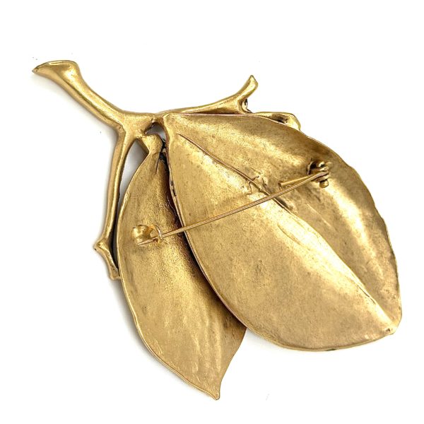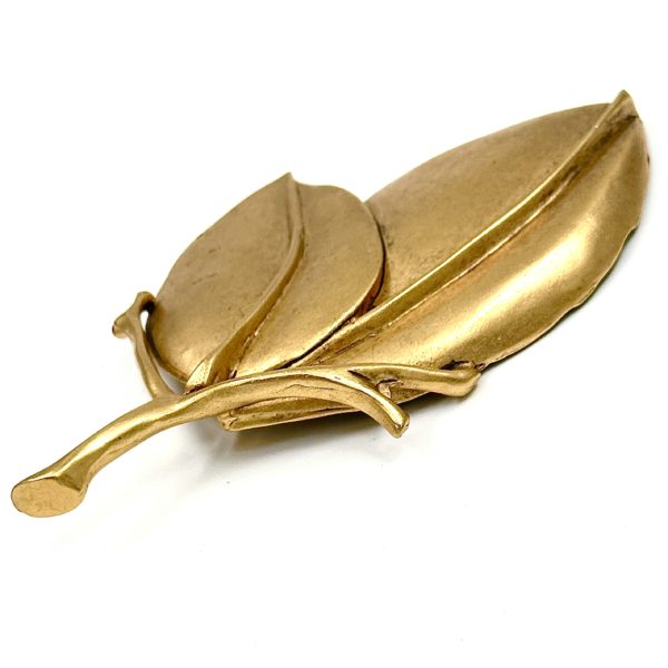 This Robert Lee Morris Gold Plated Double Wide Leaf Pin is part of a large themed group created in the late 1980’s called The Garden. These flower and vegetation pins were also used as the hardware on the new handbag collection that Morris launched in 1988. The handbags were primarily soft black Napa leather, with signature iconic matte gold plated hardware, and the collection was sold initially through Saks Fifth Avenue. All these pins/hardware designs, were carved from wax by Morris himself, displaying a unique style that is bold and spontaneous. The double wide leaf pin with the small section of branch is a beautiful design perfect for a coat or jacket. There is a flatness to this piece, hugging ones body and the exaggerated center of each leaf (what is that called?) made with a spontaneous carving hand.