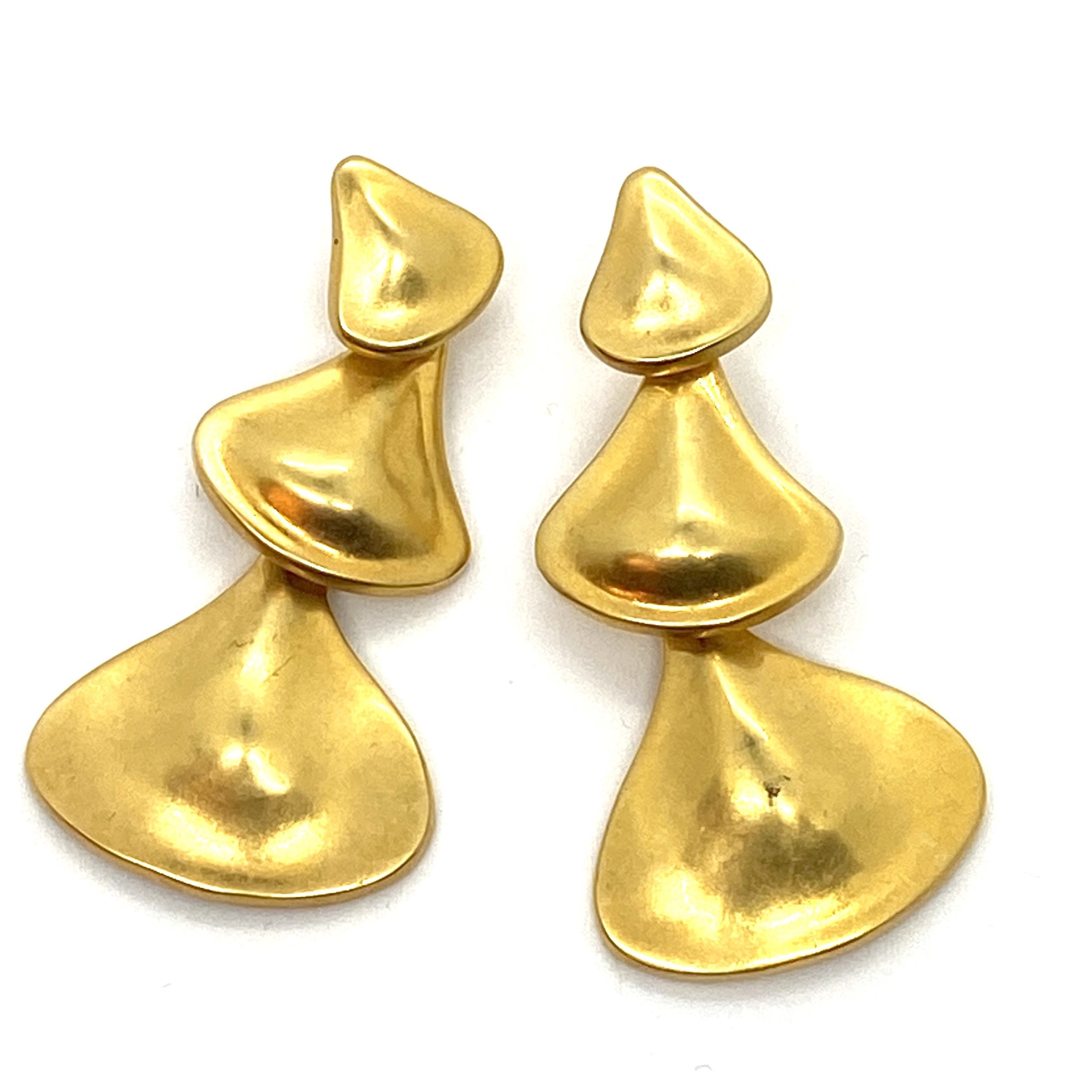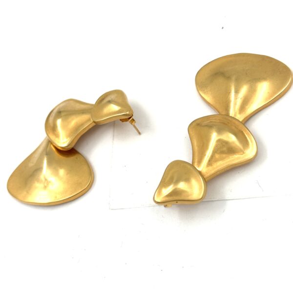These Robert Lee Morris Gold-Plated Graduated Full Fan Earrings were part of the Bold G0ld look of the dramatic 80’s fashion style. These earrings were long and dramatic. Clips of course, as all these big earrings had to go onto models’ ears during runway shows or fashion shoots and pierced earrings were more problematic. Riveted and flexible, these iconic constructions allowed for free movement and a sexy look.