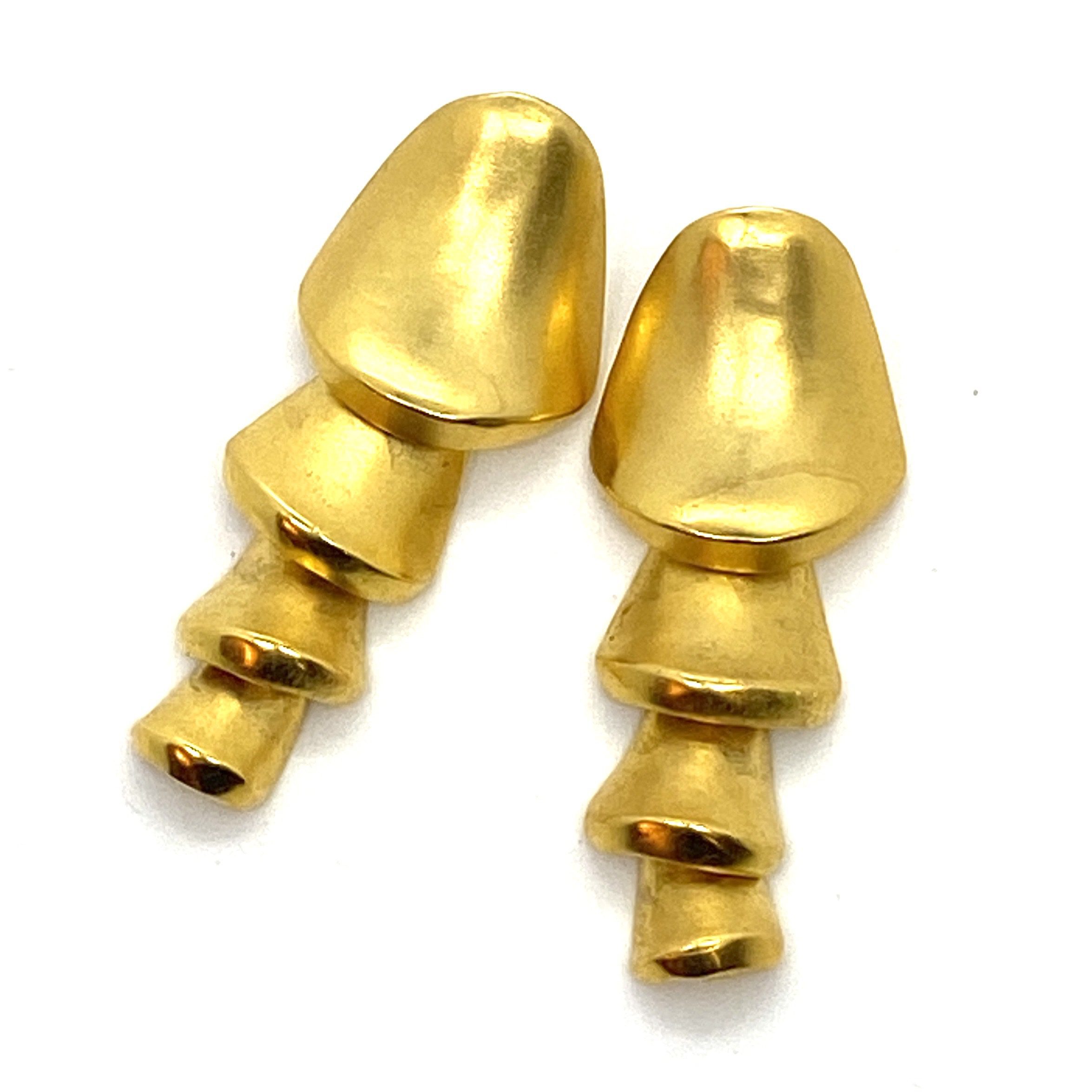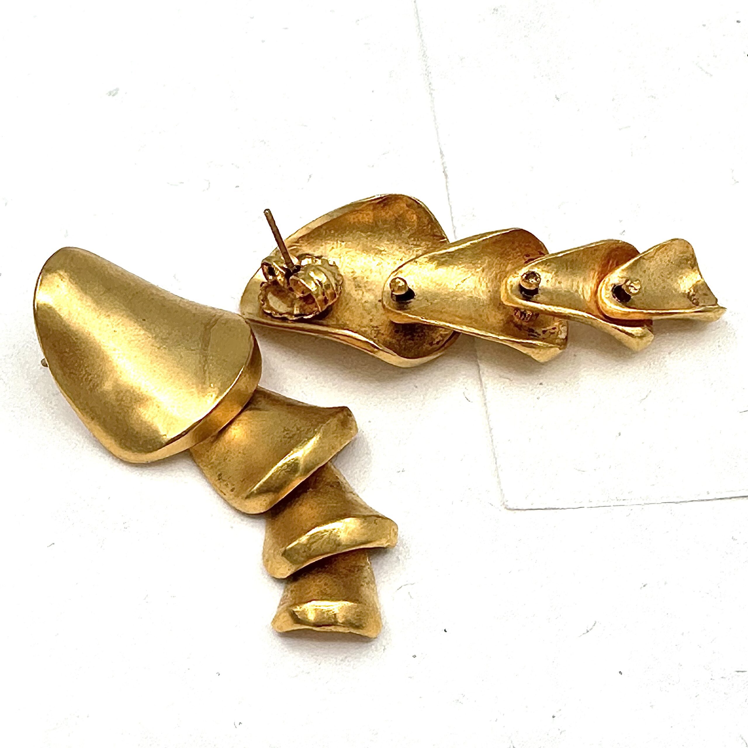 These Robert Lee Morris Gold-Plated Graduated Petal Earrings are another abstract and organic form that works beautifully as it cascades down from the ear. Overlapping and graduated organic petal forms are softly flexible and enchanting to wear. The perfect runway or everyday earring as it can be seen from quite a distance and gives immediate high fashion vibes. Clips.