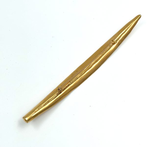 This Robert Lee Morris Gold Plated Long Leaf Pin is part of a large themed group created in the late 1980’s called The Garden. These flower and vegetation pins were also used as the hardware on the new handbag collection that Morris launched in 1988. The handbags were primarily soft black Napa leather, with signature iconic matte gold plated hardware, and the collection was sold initially through Saks Fifth Avenue. All these pins/hardware designs, were carved from wax by Morris himself, displaying a unique style that is bold and spontaneous. What is most unusual about this leaf pin is how long it is, how dramatic and striking it is at 7.4″ long. The entire form is arched, curved and alive. The scale is a trademark of Morris and his runway style. Bold and impossible to miss this is for the dedicated fashionista!