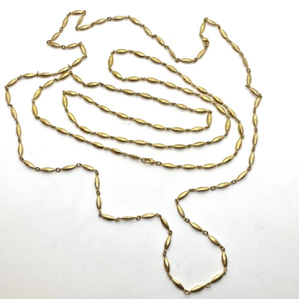 An elegant must-have for the chic wardrobe, this Robert Lee Morris Gold Plated Long Seed Chain Necklace, is 46″ long delicate chain made of little long oval seed forms. Pieces like this are so much fun to wear as they allow for many creative ways to wrap it around oneself. As part of the family of my long gold plated chains and designed to be classic and wearable forever, this is one of the most feminine chains in the RLM collection. As can be seen in the second photo, there is a second long seed chain and when added to the first one can make for a riot of fun.