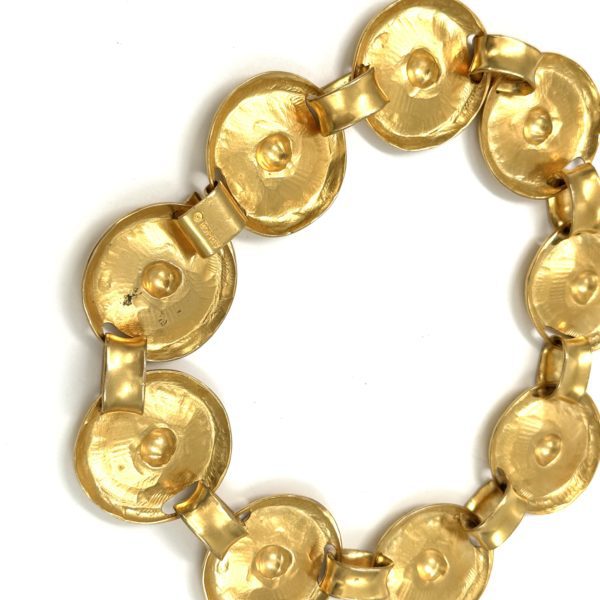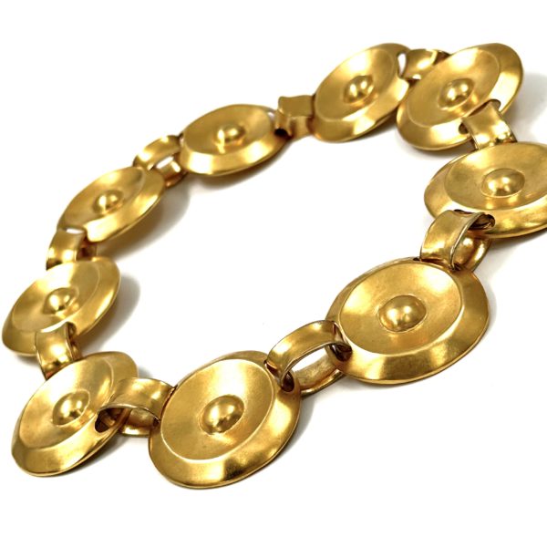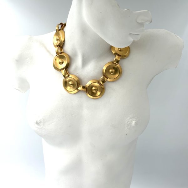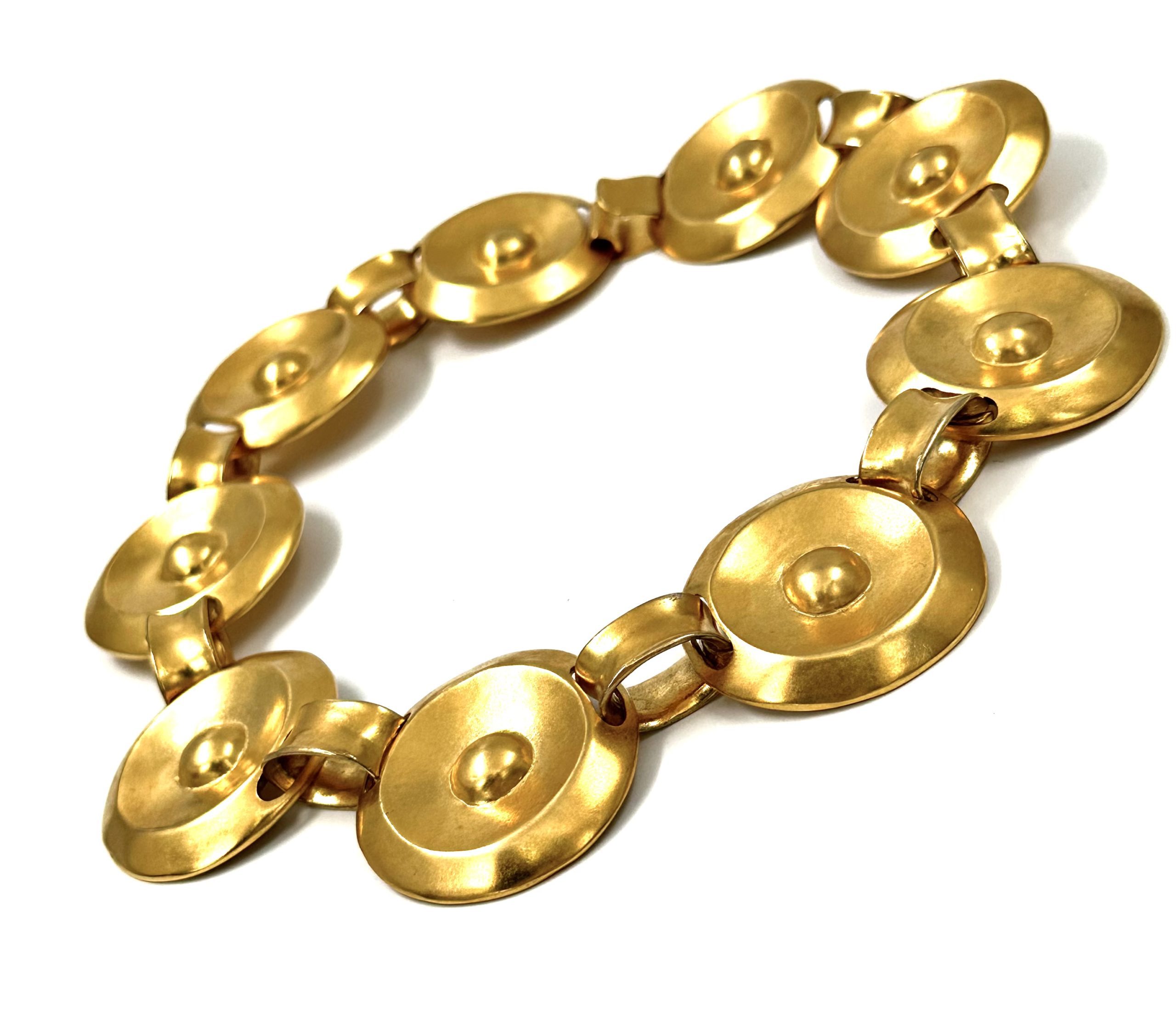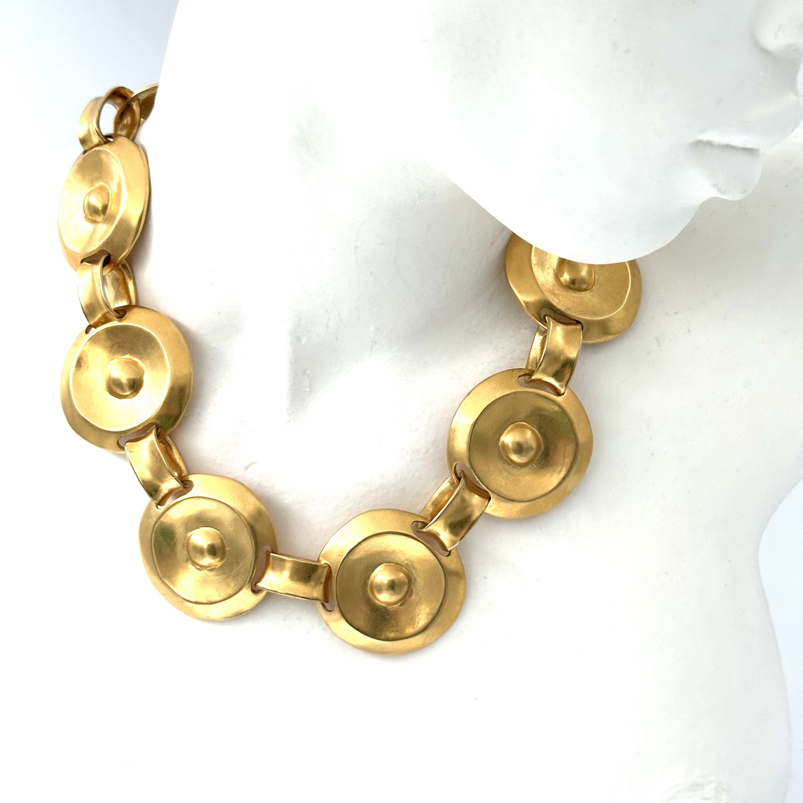 This Robert Lee Morris Gold Plated Medallion Disc Necklace is a dramatic bold gold look. Created in the early 1980’s this vintage piece is in mint condition and is a strong statement piece. The round beveled discs, were carved from wax and look like an architectural detail. Morris was intrigued by the repeating designs found in architectural moldings and this piece shows that. There is a raised dome in the middle of each beveled disc, featuring a concave well from which the dome rises. Very sculptural, and large scale for emphasis on the runway. The links that join the discs are large concave loops, giving the piece a vey gutsy look.