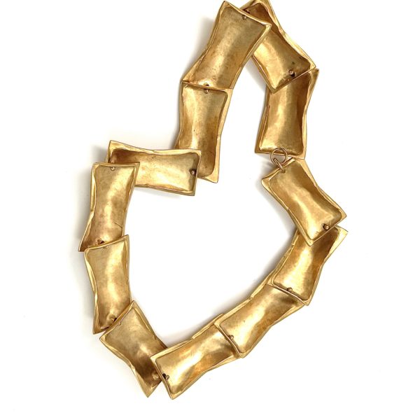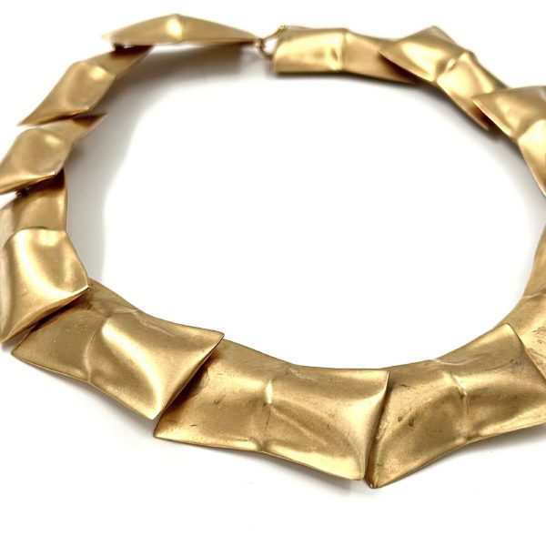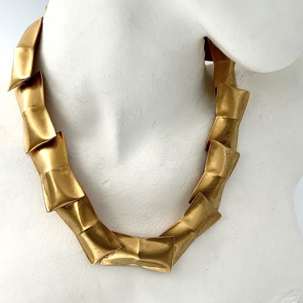 This Robert Lee Morris Gold Plated Pinched Package Necklace is a good example of how Morris experimented all the time with new forms and shapes to update his very popular jewelry lines. This unusual necklace is composed of what seems like little hollow packages, maybe like pasta, or Japanese rice crackers. This most unique and odd shape is linked with invisible connections that allow each unit to sit on top of the next in a bold run around the neck. The pieces are indeed hollow as seen by looking at the back of the necklace, but the illusion of great volume is the point of this piece. Lightweight but substantial looking, the strength of this dramatic necklace is in the originality of the designs, mysterious and yet classic.