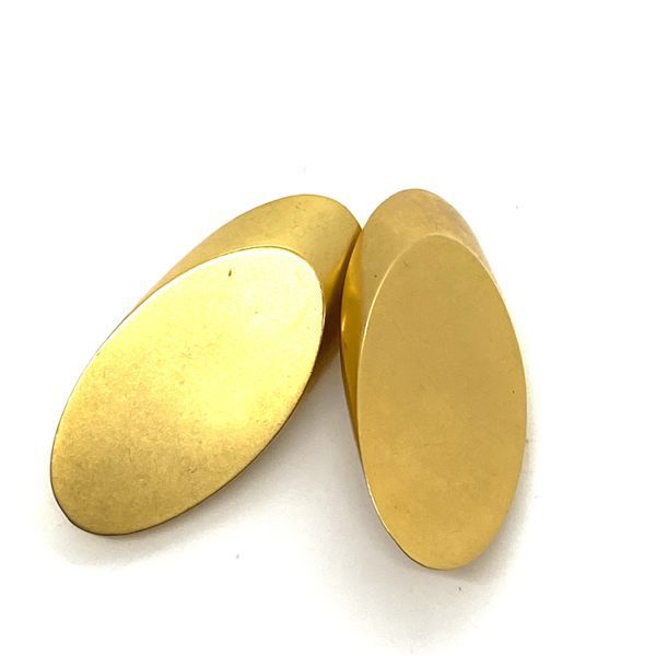 These Robert Lee Morris Gold Plated Slice Earrings are architectural in shape, sliced cylinders, cut at a sharp angle to achieve a dramatic form. Used extensively in his 1985 KL Sport show in New York City, Karl Lagerfeld loved this bold form and had me make it into large brooches and earrings for his runway. Originally designed in 1974, when I was experimenting with metal shapes and the concept of Liquid Geometry, whereby straight, or angular forms could be cut up and re assembled to become flexible and wearable. Matte gold plated brass, the earrings are hollow, lightweight, and clips.
