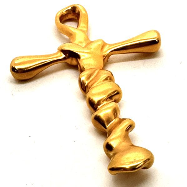 When crosses were a huge trend in fashion at the beginning of the 1990’s, RLM created many original variations that he sold as pendants. This one is a gold plated solid brass pendant, and comes with a 20: black linen cord. The carving is to represent how a Heart form at the apex of the four cross joint is turned into a spiraling design. Large and hefty, this is a good example of the Bold Gold designs that became signature RLM designs during this turbulent time in fashion.