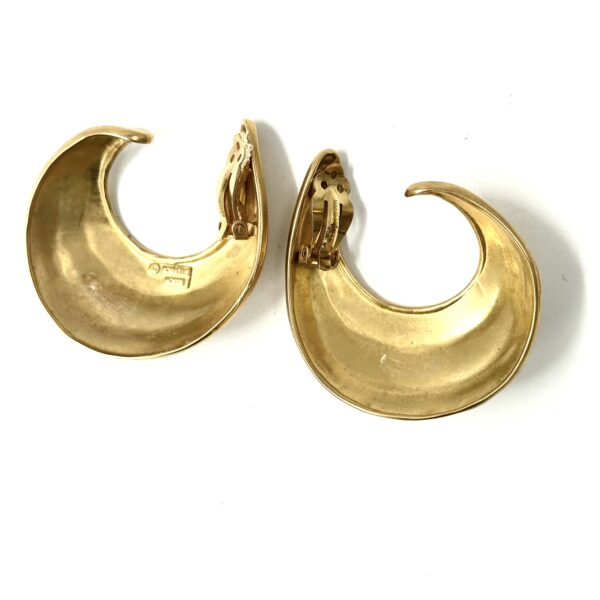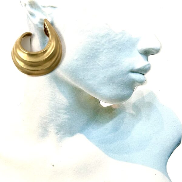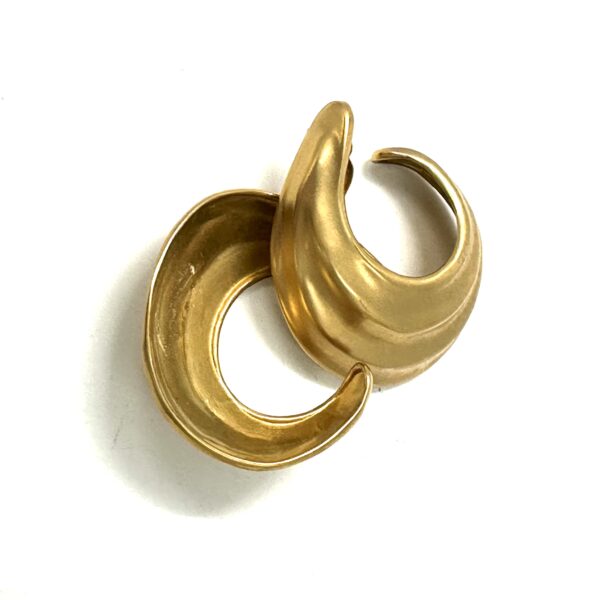 These Robert Lee Morris Gold Ribbed Hoop Earrings are clip-on and quite bold. The pale green gold plating on the brass is an unusual color, more like a cool warm gold. This ribbed design was created by the technique called repousse whereby the raised ridges are hammered into the design from behind. Often using a tar bowl to hold the piece still while hammering. Then a mold is made and the earrings are cast.