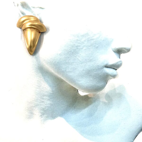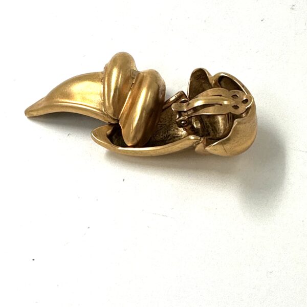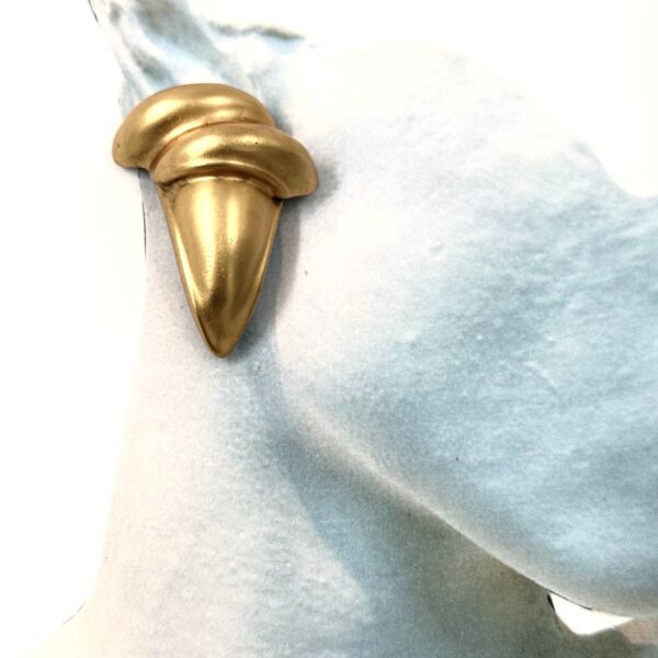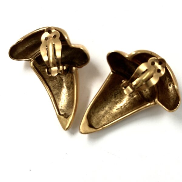 These Robert Lee Morris Gold Sculptural Claw Earrings were made for Donna Karan in the early 90’s. Clip-on earrings like these are perfect for positioning the earrings just how one likes to have it angled on the ear. Gold plated brass, these are part of the “Claw” or Fang design that was pervasive during the 1990 Spring collection for Donna Karan.