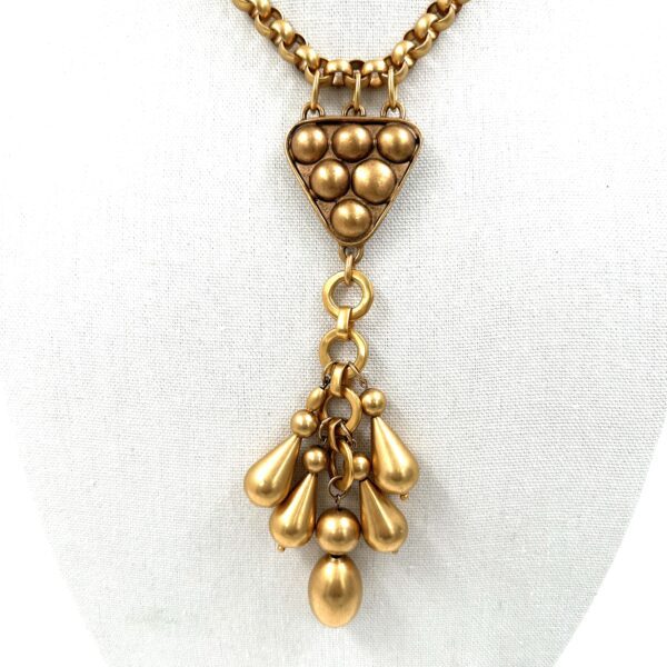 This Robert Lee Morris Golden Bead Y Necklace, was just recently made for the 2024 holiday season. It is a short piece at 16.5″ long with a dramatic ย 8″ long drop terminating in a cluster of gold-plated beads. A fun piece for the parties around the holidays!