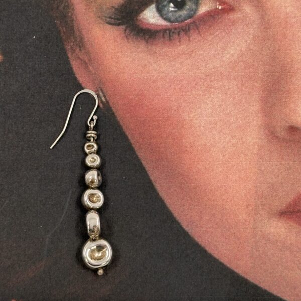 This one of a kind pair of Robert Lee Morris Graduated Dimpled Silver Ball Drop Earrings are weightless. This unique design, of a dimpled ball, became an iconic signature bead for Morris. Hand made, these rare long drop earrings are not shiny but have an antiqued, oxidized look to them. Soul filled earrings with silver sheperd hooks.