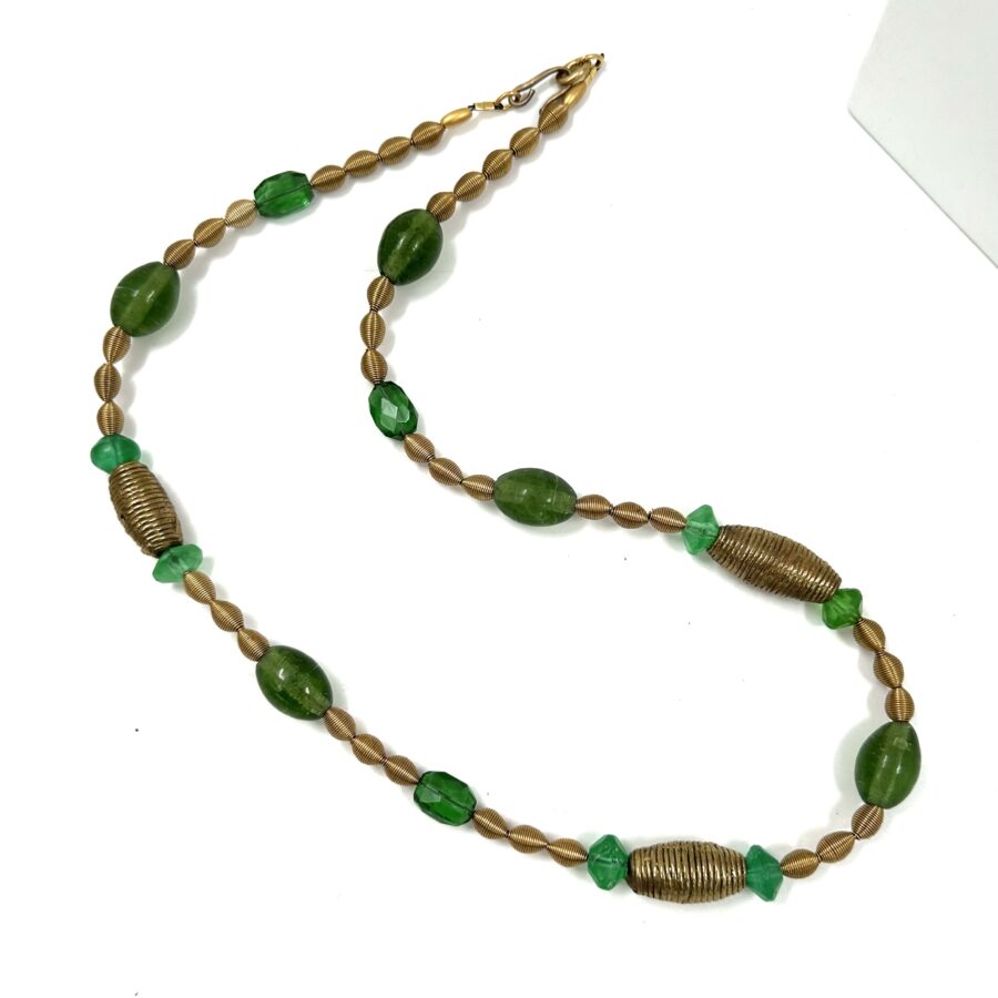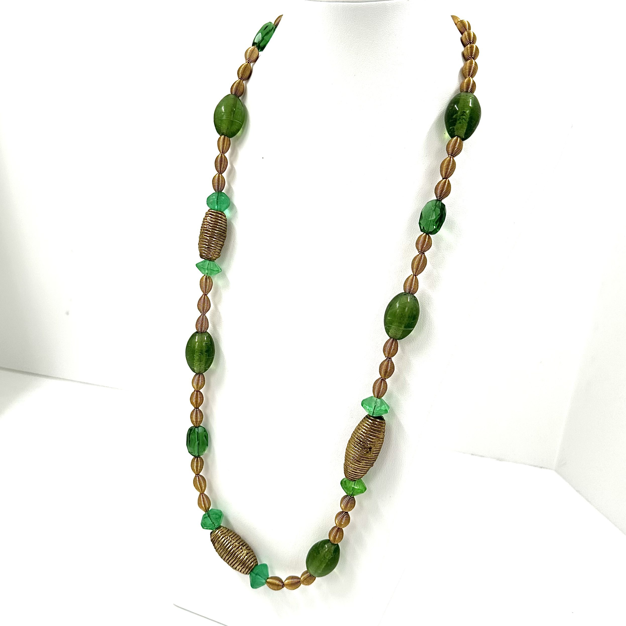 This Robert Lee Morris Green Glass Station Rope Necklace is another long drape green themed necklace meant to layer with other necks.It features emerald green glass, vintage faceted beads and African recycled Olive shaped beads. The metal is aged brass, with African wrapped wire beads, creating a lovely understated semi worn tone that is sheer Wabi Sabi color.