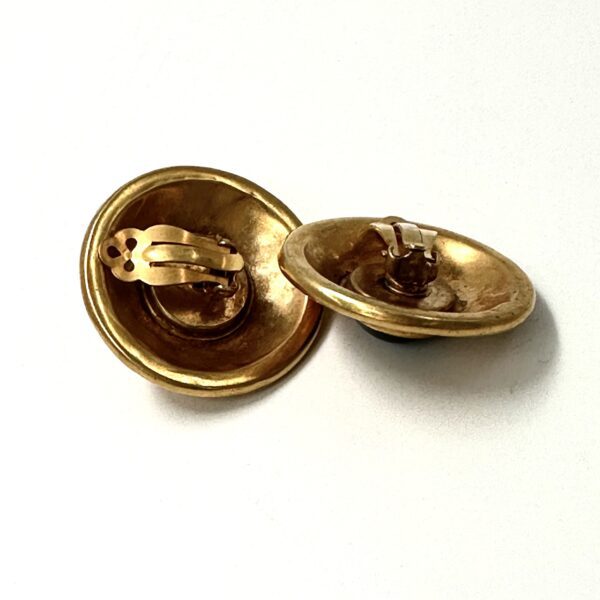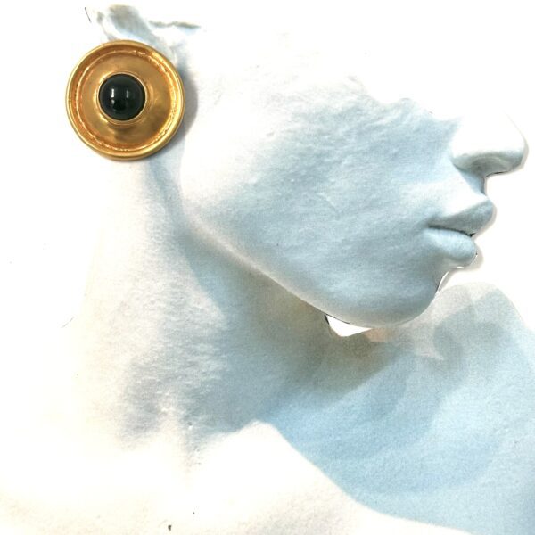These Robert Lee Morris Green Serpentine Disc Earrings for Donna Karan are classic Iconic Donna. The colors that season, fall 1986, were black jade green and red carnelian, set into riv=ch 24k gold plated brass jewelry. Clips