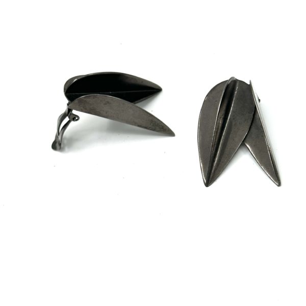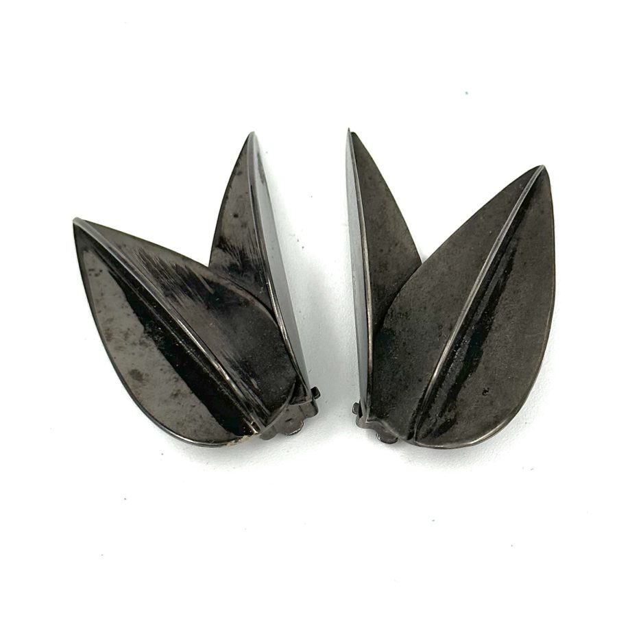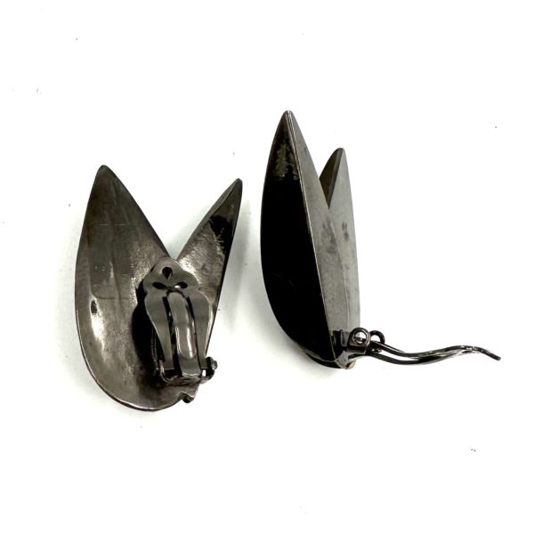 These Robert Lee Morris Hematite Plated Half Dart Clip Earrings are from the early 1980s when fashion trends were towards the architectural, less is more mentality. The Dart family was born shortly after the triumphant Calvin Klein fall 1981 collection for which Morris won the Coty Award. The Dart design was taken from the feathers configuration on a throwing dart. These earrings are clips and are electroplated in a shiny hematite finish.